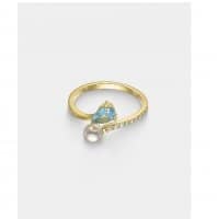 Δαχτυλίδι με λευκό μαργαριτάρι και γαλάζιο zircon από επιχρυσωμένο Ασήμι 925° που συνδυάζει την κλασική κομψότητα του λευκού μαργαριταριού με τη φωτεινή γοητεία ενός γαλάζιου ζιργκόν σε σχήμα δάκρυ. Η ανοιχτή γραμμή του δαχτυλιδιού είναι διακοσμημένη με λευκά ζιργκόν, δημιουργώντας ένα κόσμημα γεμάτο ρομαντισμό και θηλυκότητα.