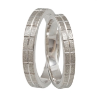 Λευκόχρυση βέρα γάμου και αρραβώνα 9 καρατίων και πλάτος 3mm, σε μοντέρνο σχέδιο με σκαλιστή επιφάνεια πάνω στην οποία σχηματίζονται τετραγωνάκια με ματ φινίρισμα.