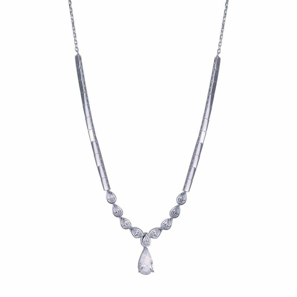 Κολιέ χρυσό 14 Καρατίων,  με ιδιαίτερο μοντέρνο σχέδιο από ζιργκόν Swarovski με μονόπετρο σχέδιο δάκρυ περιβαλλόμενο από πιο μικρές πέτρες ζιργκόν Swarovski και ορθογώνια στοιχεία.