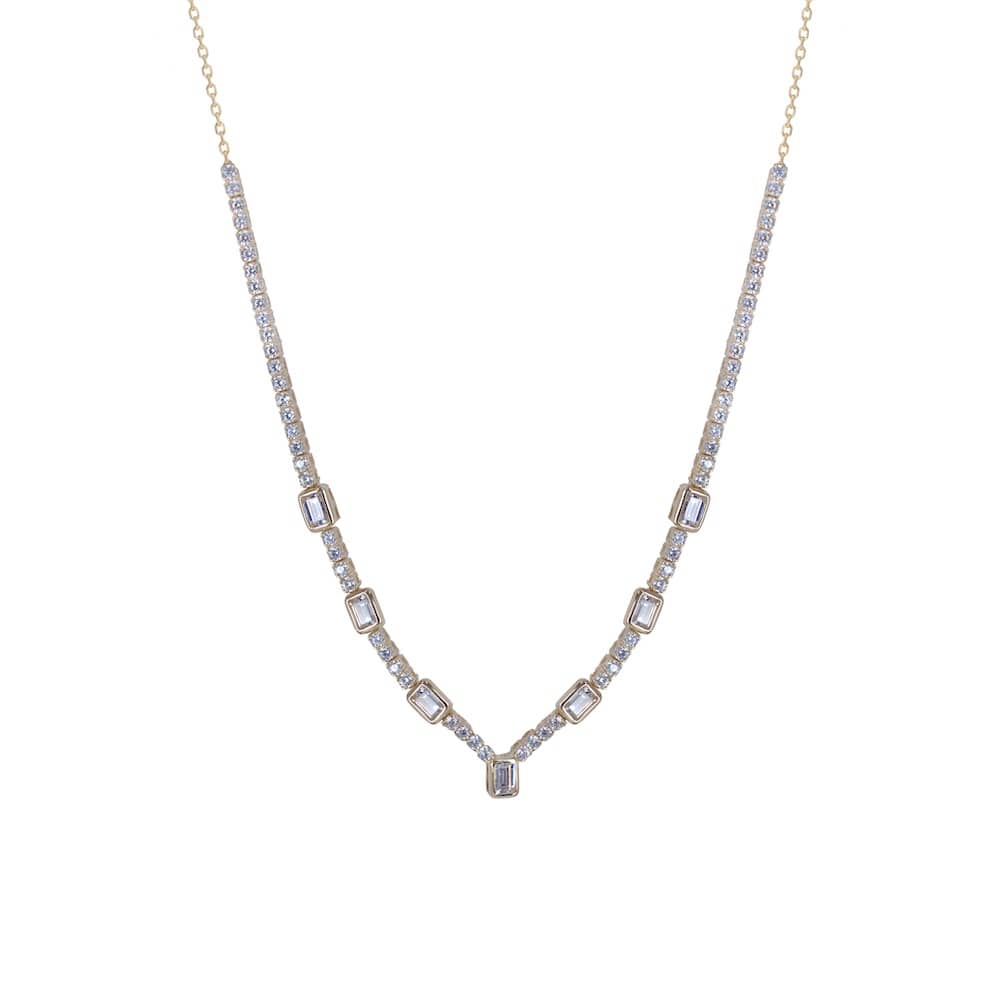 Σετ χρυσό 14 Καρατίων, με ιδιαίτερο μοντέρνο σχέδιο από μονή σειρά με ζιργκόν Swarovski με ενδιάμεσες πέτρες ζιργκόν Swarovski σε ορθογώνιο σχήμα .