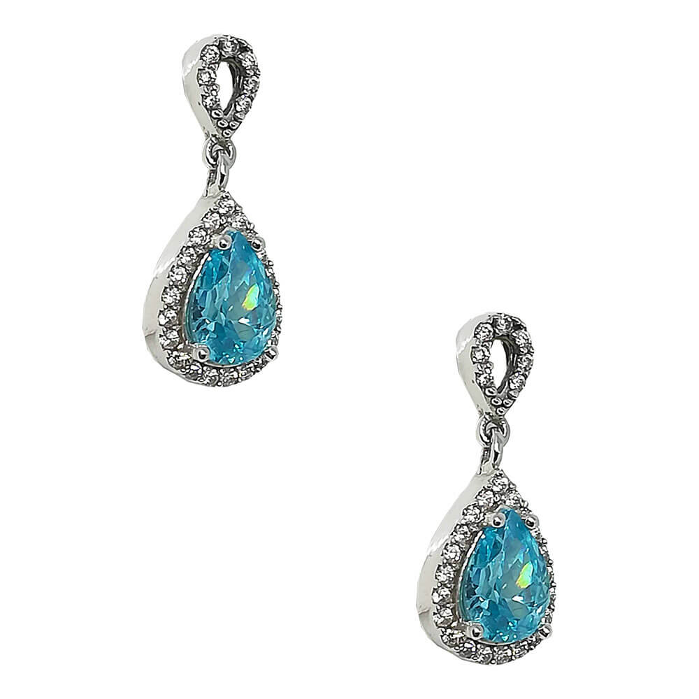 Λευκόχρυσα σκουλαρίκια κρεμαστά 14 καρατίων με γαλάζια πέτρα και λευκές πέτρες ζιργκόν Swarovski.
