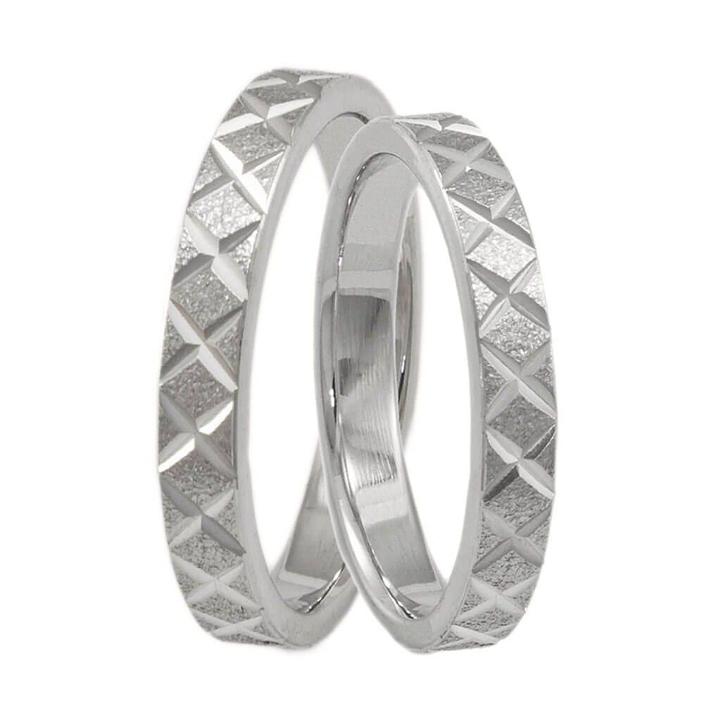 Λευκόχρυση βέρα γάμου και αρραβώνα Μatteo 9 καρατίων και πλάτος 3mm, σε μοντέρνο σχέδιο με σκαλιστή επιφάνεια πάνω στην οποία σχηματίζονται ρόμβοι με ματ φινίρισμα.