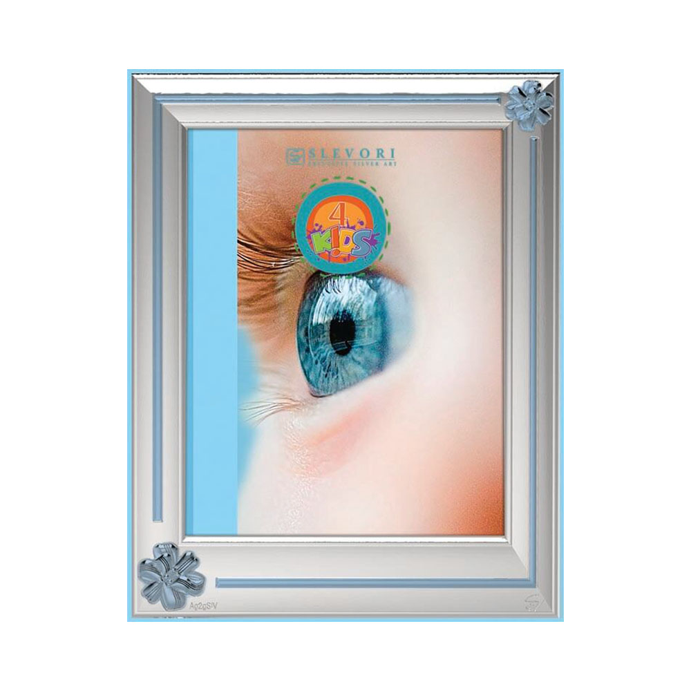Ασημένια παιδική κορνίζα Slevori, με διακοσμητικό φιόγκο, σε σιέλ χρώμα.
