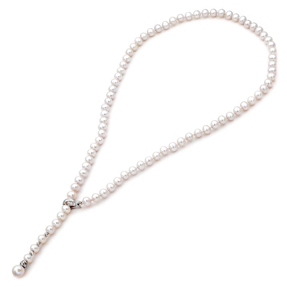 Κολιέ με λευκά μαργαριτάρια γλυκού νερού Fresh Water Pearl διαμέτρου 6,0 έως 6,5 χιλιοστών σε σχήμα Round (στρόγγυλο) ποιότητας ΑΑΑ. Διαθέτει κούμπωμα ασφαλείας από λευκόχρυσο 14 καρατίων, το οποίο μπορεί και κλείνει σε όποιο σημείο επιθυμείτε δημιουργώντας διαφορετικά στυλ. Στο κάτω μέρος του υπάρχουν 4 λευκόχρυσα στοιχεία 14 καρατίων με τεχνική διαμανταρίσματος και ένα μεγαλύτερο μαργαριτάρι γλυκού νερού Fresh Water Pearl διαμέτρου 7,0 έως 8,0 χιλιοστών σε σχήμα Round (στρόγγυλο) ποιότητας ΑΑΑ. Είναι δεμένο με μεταξωτό νήμα που δημιουργεί κόμπους ενδιάμεσα στα μαργαριτάρια για λόγους προστασίας και ασφάλειας. Το συνολικό του μήκος είναι 53-54 εκατοστά, μπορείτε όμως να το παραγγείλετε σε όποιο μήκος επιθυμείτε.