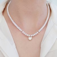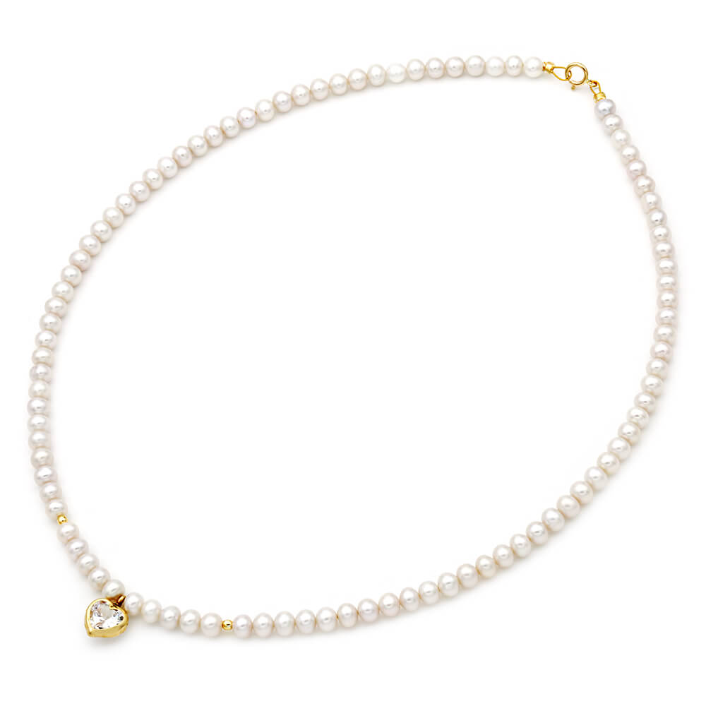 Κολιέ με λευκά μαργαριτάρια γλυκού νερού Fresh Water Pearl διαμέτρου 4,5 – 5,0 χιλιοστών σε σχήμα Round (στρόγγυλο) ποιότητας ΑΑΑ. Στο κέντρο του υπάρχει ένα χρυσό μενταγιόν 14 καρατίων με ζιρκόν σε σχήμα καρδιάς καθώς και 2 χρυσές μπίλιες 14 καρατίων με διάμετρο 2,5 χιλιοστά. Διαθέτει επίσης χρυσό κούμπωμα ασφαλείας 14 καρατίων. Είναι δεμένο με ειδικό ατσαλόσυρμα υψηλής αντοχής σε κίτρινο χρωματισμό. Το συνολικό του μήκος είναι 43 – 44 εκατοστά, όμως μπορείτε να το παραγγείλετε σε όποιο μήκος επιθυμείτε.