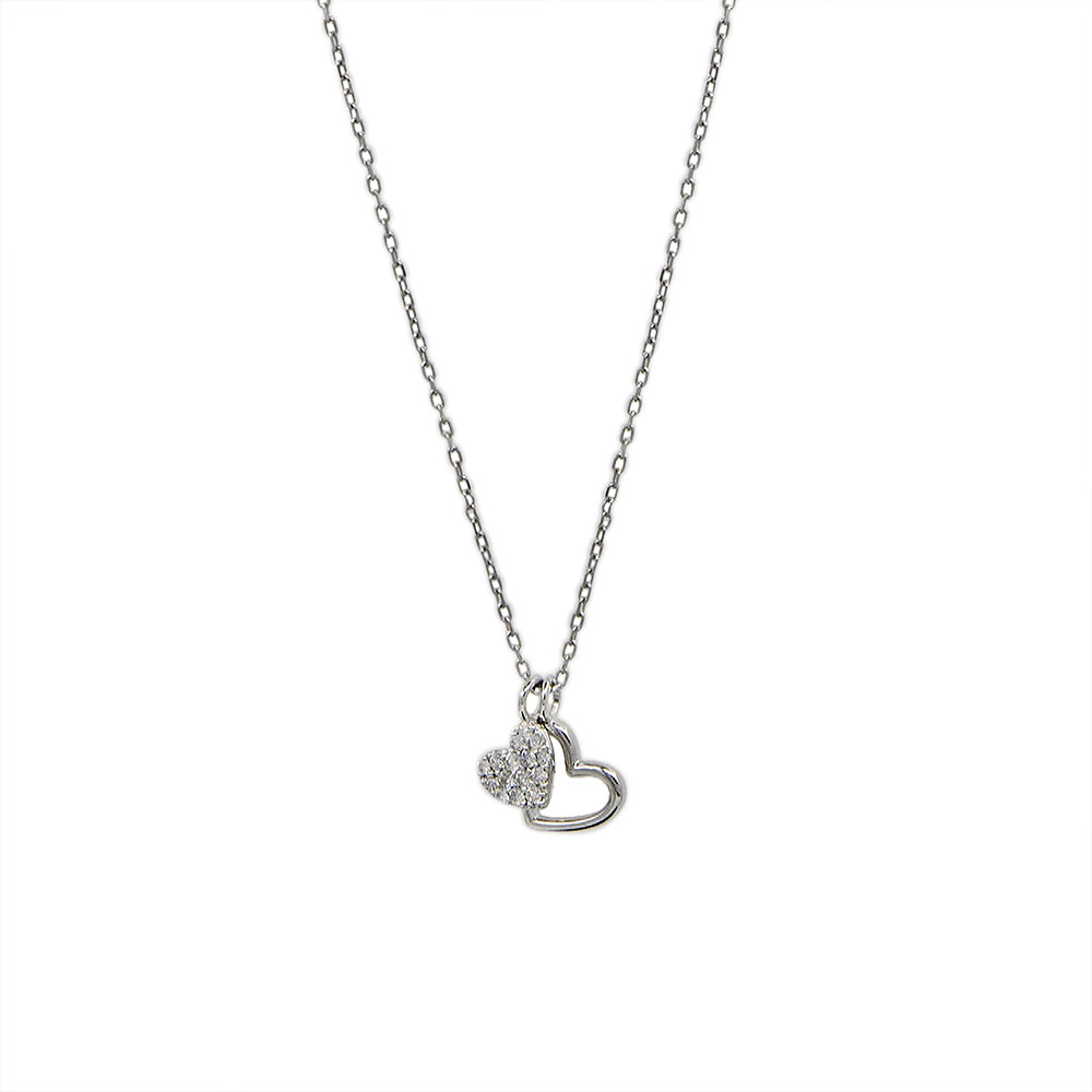 Λευκόχρυσο κολιέ 14 Καρατίων σε σχήμα καρδίες. Την μία καρδιά στολίζουν διαμάντια.
