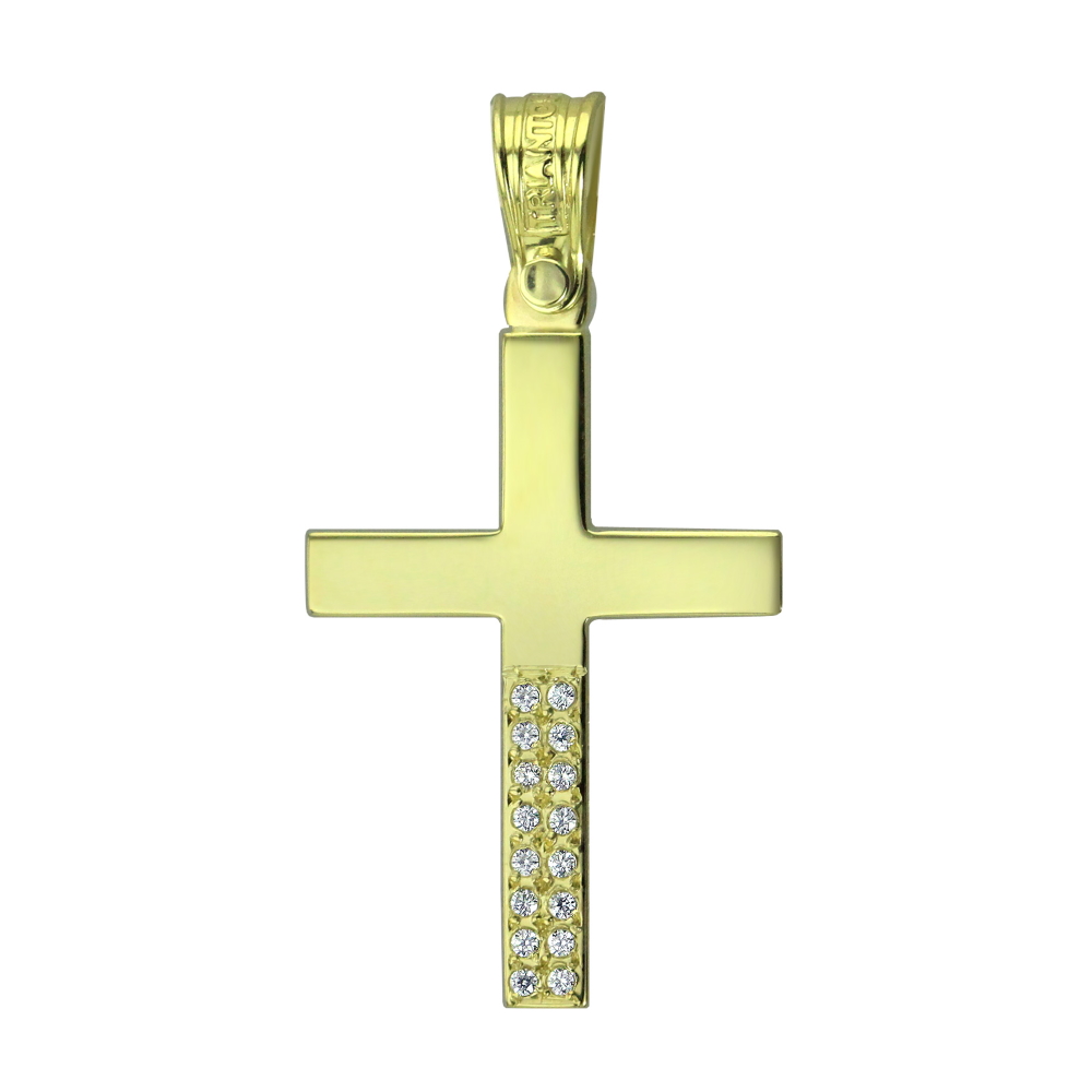 Χρυσός σταυρός Τριάντος, 14 Kαρατίων, γυναικείος, με λουστρέ φινίρισμα με λευκά ζιργκόν Swarovski στο κάτω μέρος του.