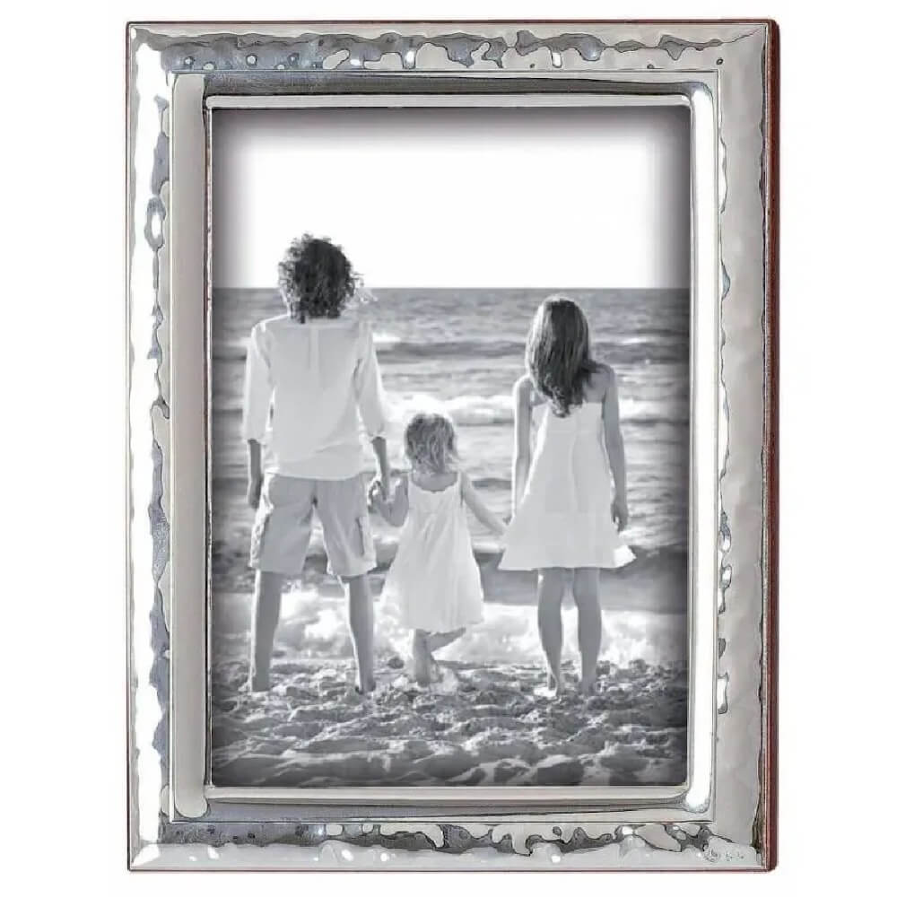Κορνίζα από ασήμι 925, με σφυρήλατες λεπτομέρειες και λείο φινίρισμα. Η πλάτη είναι ξύλινη σε καφέ χρώμα.