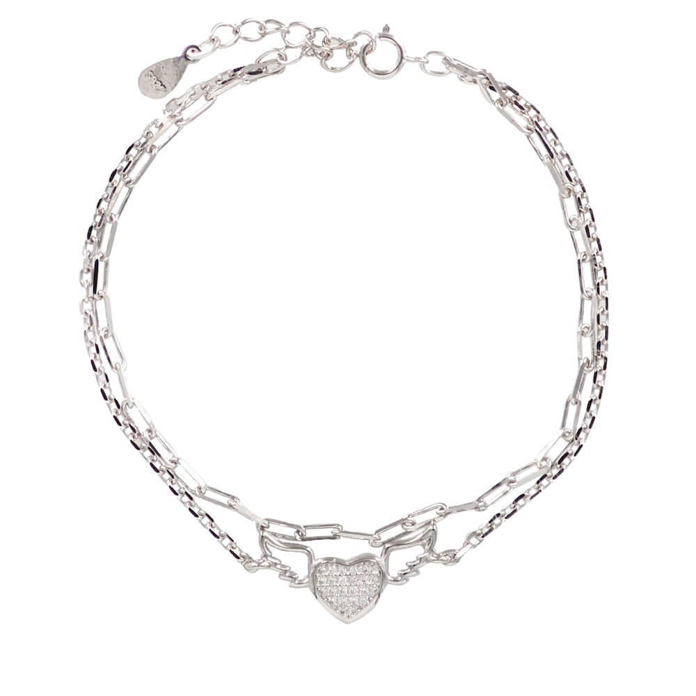Ασημένιο βραχιόλι 925° με διπλή αλυσίδα, με διακοσμητικό σχέδιο και λευκές πέτρες ζιργκόν.