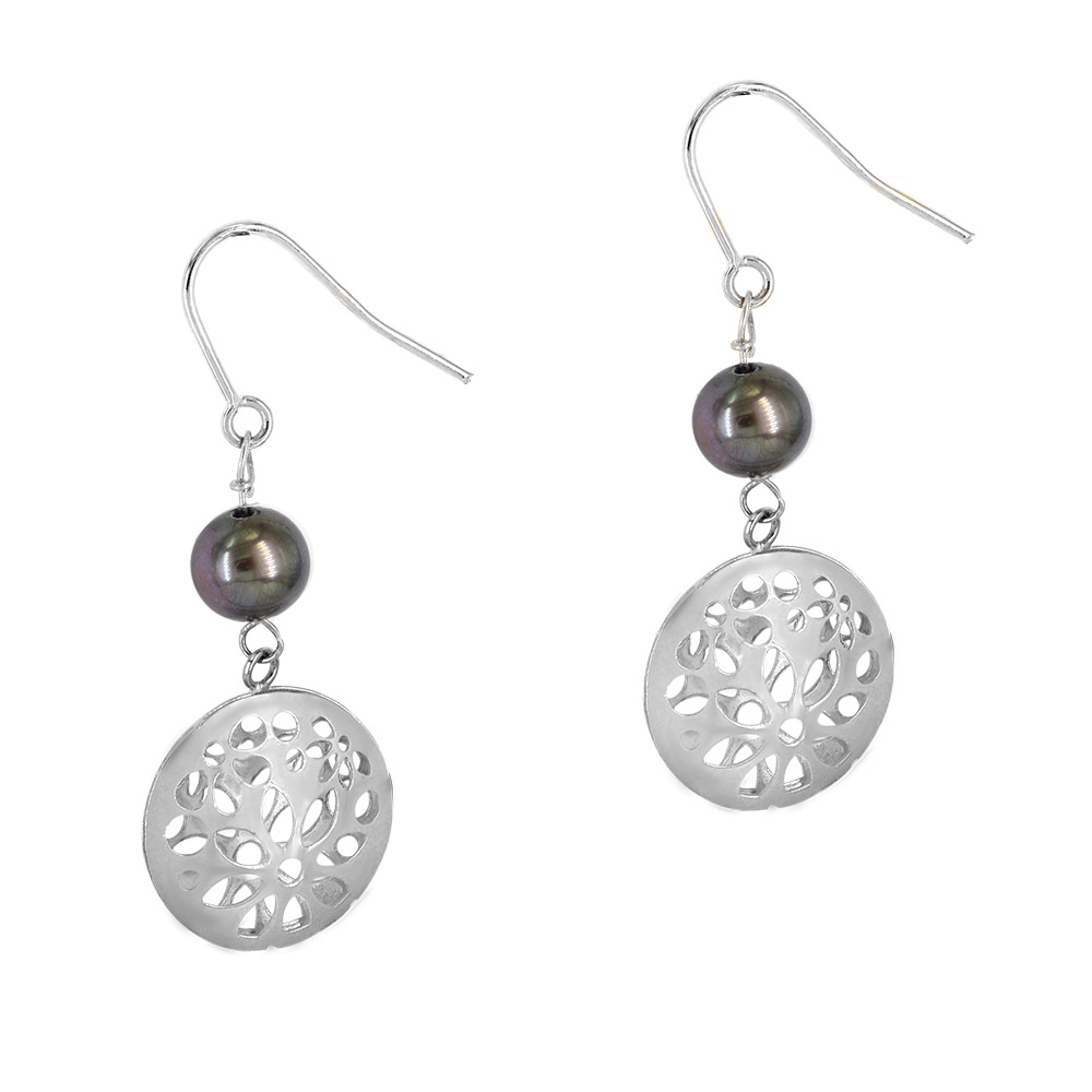 Λευκόχρυσα σκουλαρίκια κρεμαστά, στρογγυλά με μαύρες πέρλες 14 Καρατίων