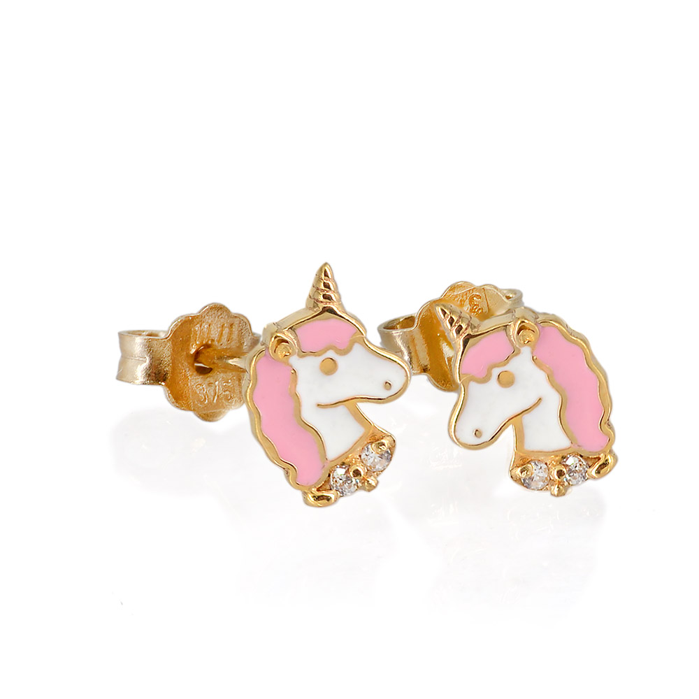 Χρυσά Σκουλαρίκια καρφωτά 14 Καρατίων με σμάλτο, μονόκερος (unicorn).