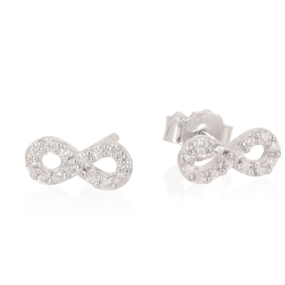 Λευκόχρυσα σκουλαρίκια καρφωτά 14 Καρατίων σε σχήμα άπειρο με λευκές πέτρες ζιργκόν .