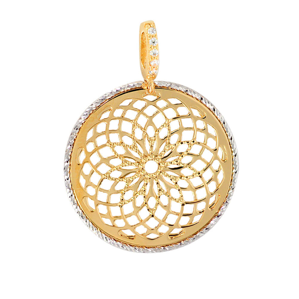 Δίχρωμο μενταγιόν, λευκό και κίτρινο χρυσό 14 Καρατίων, σε σχήμα στρογγυλό με περίτεχνο σχέδιο κα λευκές πέτρες ζιργκόν στον κρίκο του.