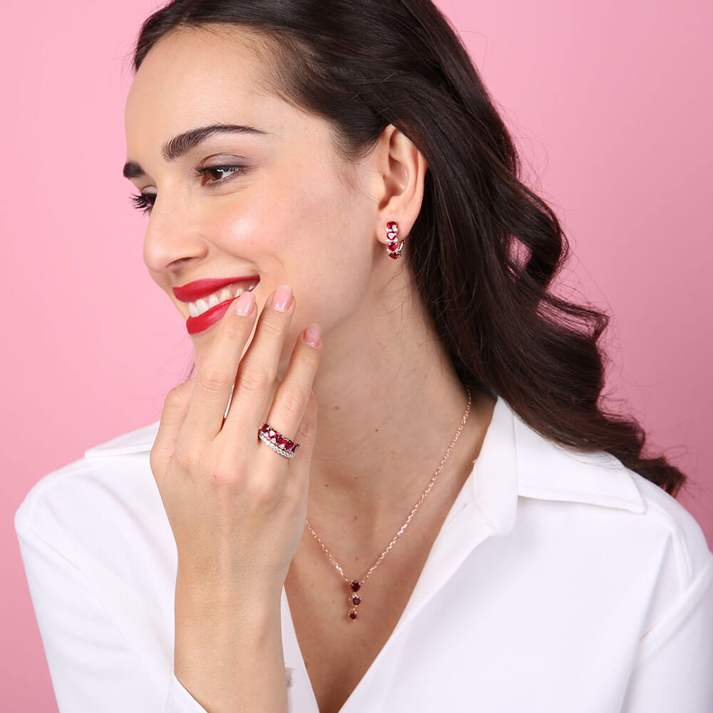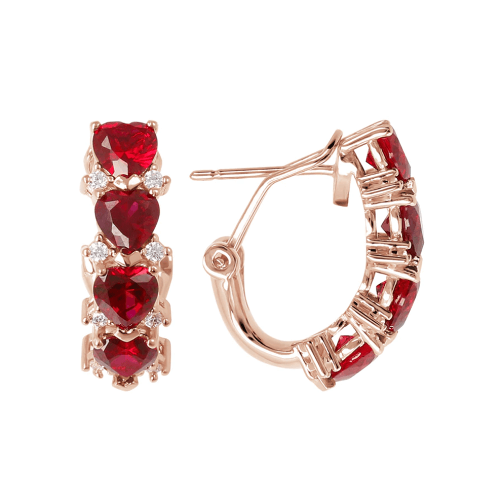 Ορειχάλκινα σκουλαρίκια κρίκοι Bronzallure, με κόκκινο συνθετικό κουρούνδιο σε σχήμα καρδιάς και μικρότερα λευκά ζιργκόν, με ροζ χρύσωμα Κ18.