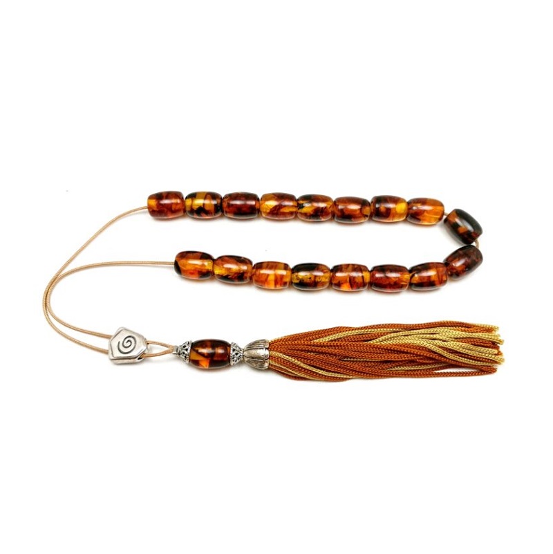 Κομπολόι από τεχνητή ρητίνη,μέγεθος χάντρας 12x15mm,στολισμένο με μεταλλικά στοιχεία και φούντα από φυτικό μετάξι που δεν τσαλακώνεται και δεν ξεφτίζει. Το σχέδιο διατίθεται με δίχρωμη φούντα (κόκκινο & λευκό)