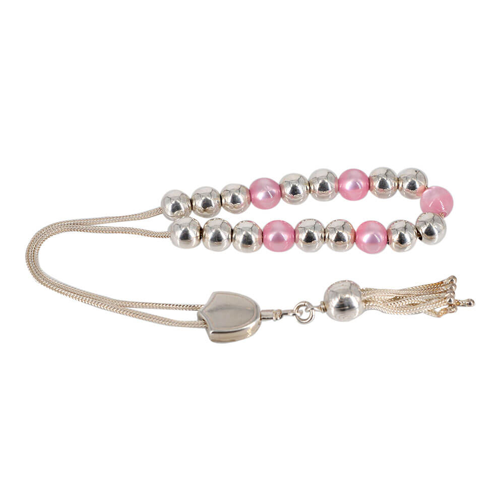 Ασημένιο κομπολόι με ασημένιες μπίλιες και μπίλες από ροζ χαλαζία, και ασημένια αλυσίδα.