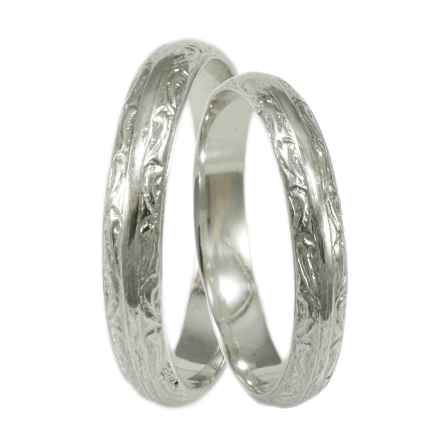 Λευκόχρυση βέρα γάμου και αρραβώνα 9 καρατίων και πλάτος 3mm, σε μοντέρνο σχέδιο με σκαλιστή επιφάνεια πάνω στην οποία σχηματίζονται ρόμβοι με ματ φινίρισμα.