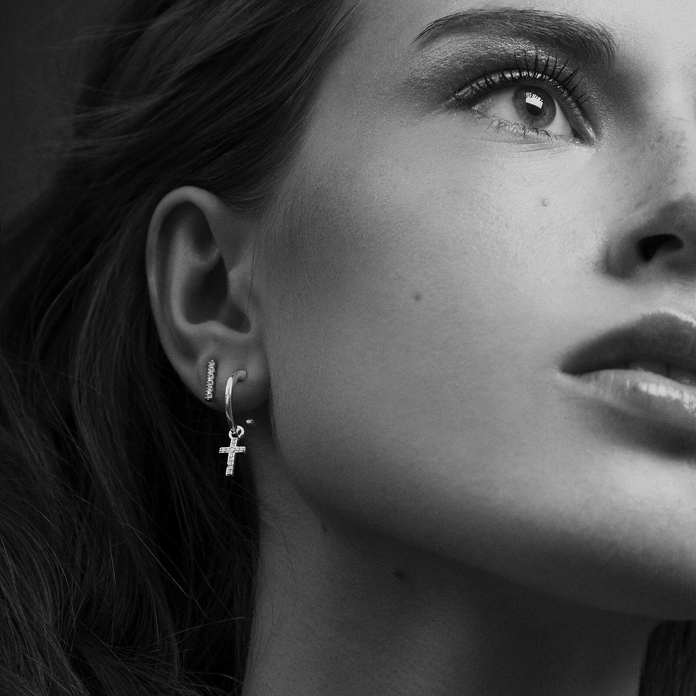 Ορειχάλκινα σκουλαρίκια σε σχήμα ημικυκλικής στεφάνης με κρεμαστό μοτίφ σταυρό, Dansk, από τη συλλογή Illuminate Yourself, σειρά Shimmer, επιχρυσωμένα με χρυσό 14 καρατίων. Ο σταυρός φέρει πέτρες από γυάλινο κρύσταλλο.