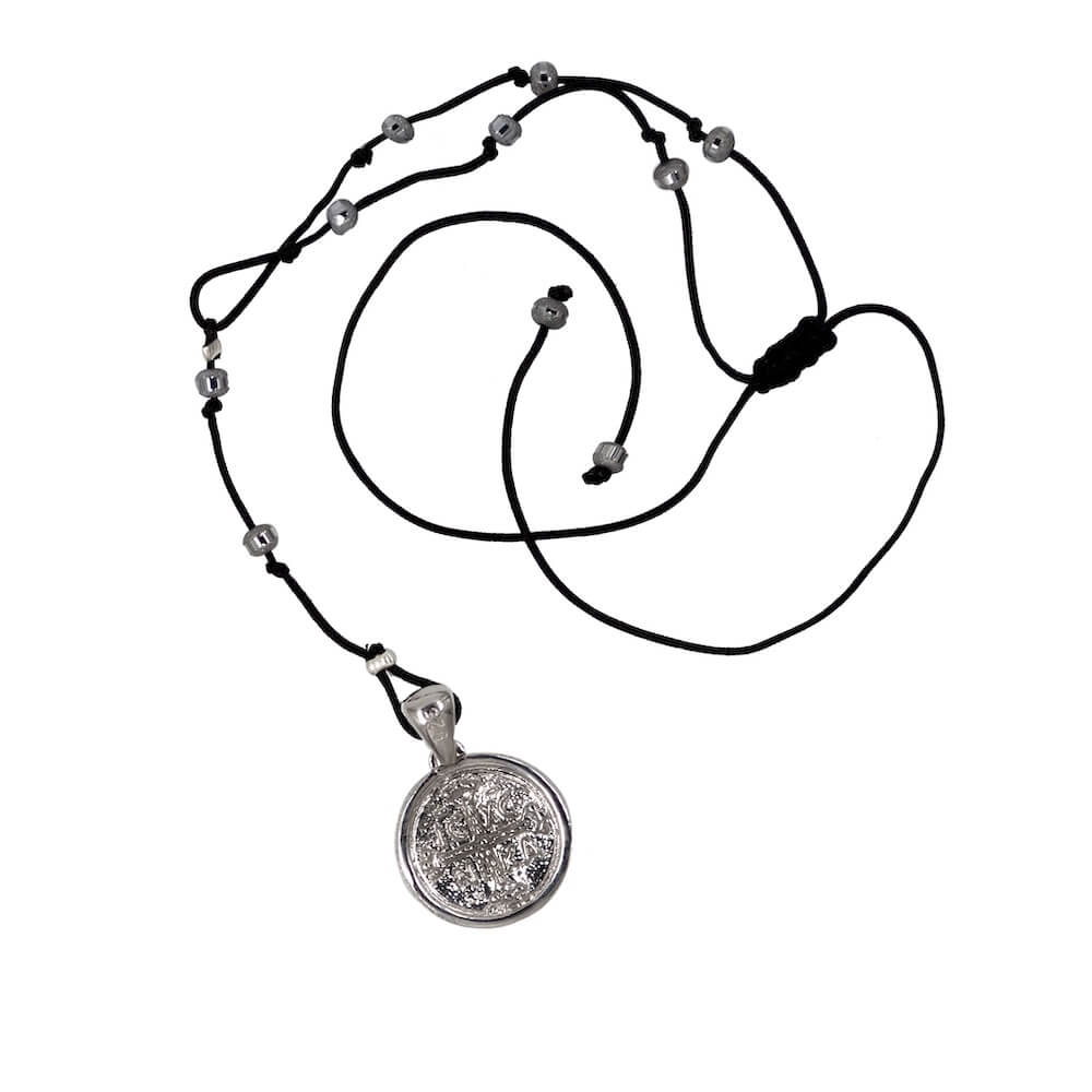 Ασημένιο επιχρυσωμένο φυλακτό αυτοκινήτου διπλής όψεως με την Παναγία και τον Ιησού Χριστό στην μία όψη και Ιησούς Χριστός Νικά στην άλλη όψη.