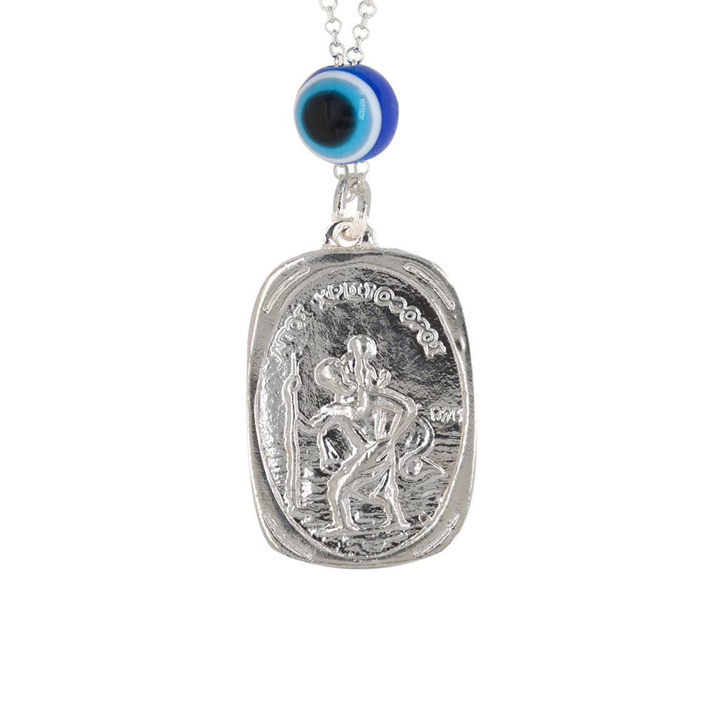 Ασημένιο φυλακτό αυτοκινήτου διπλής όψεως με τον Άγιο Χριστόφορο και την Παναγία και μπλέ χάντρα ή ματάκι