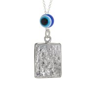 Ασημένιο φυλακτό αυτοκινήτου διπλής όψεως με τον Άγιο Χριστόφορο και την Παναγία και μπλέ χάντρα ή ματάκι