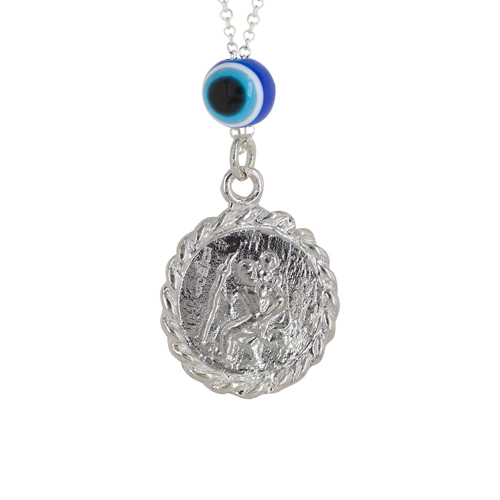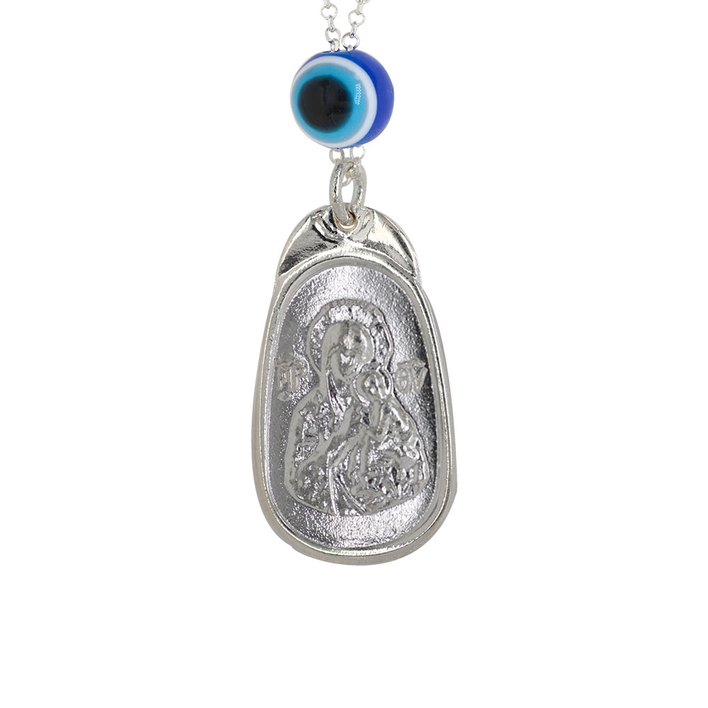 Ασημένιο φυλακτό αυτοκινήτου διπλής όψεως με τον Άγιο Χριστόφορο και την Παναγία και μπλέ χάντρα ή ματάκι