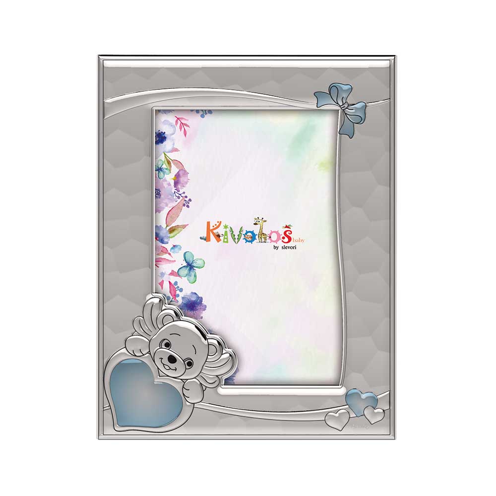 Ασημένια παιδική κορνίζα 925, Slevori, σε σιέλ χρώμα, με αρκουδάκι και καρδούλα.