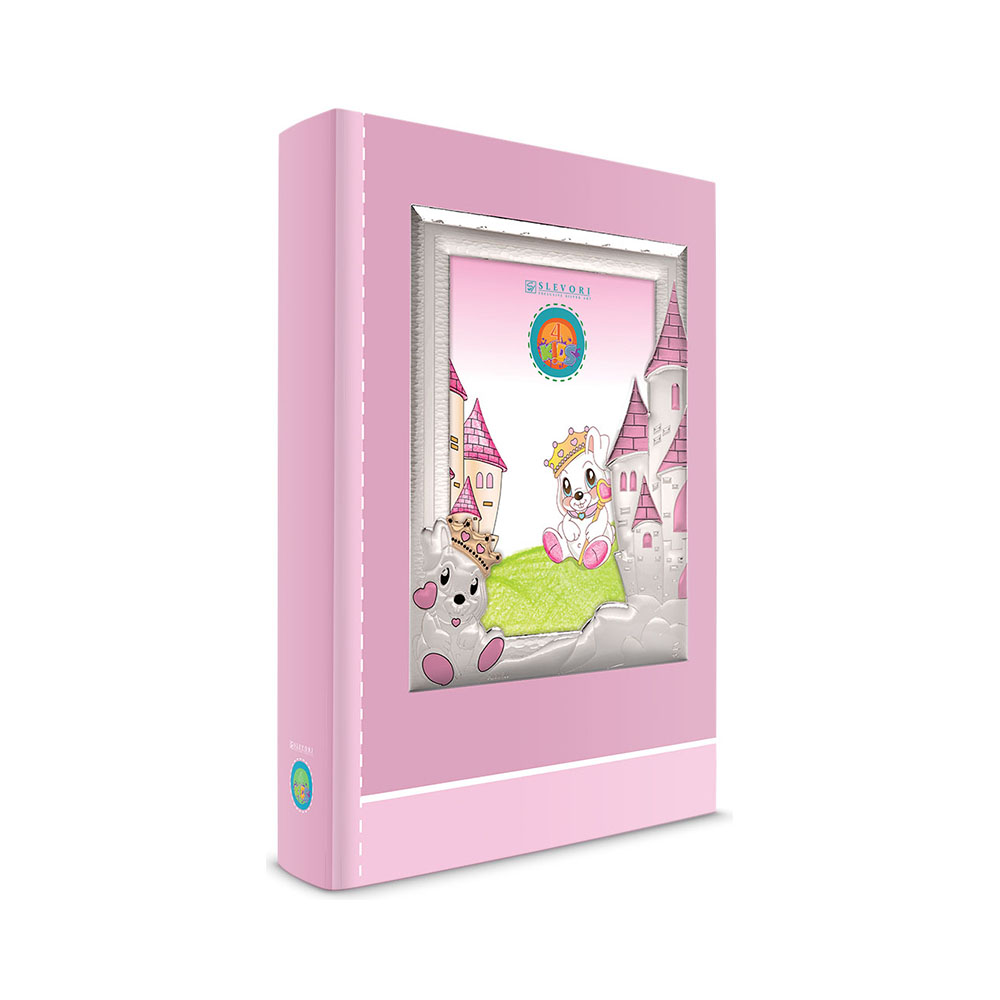 Ασημένια παιδική κορνίζα Slevori, με διακοσμητικό λαγουδάκι και κάστρο, σε ροζ χρώμα.
