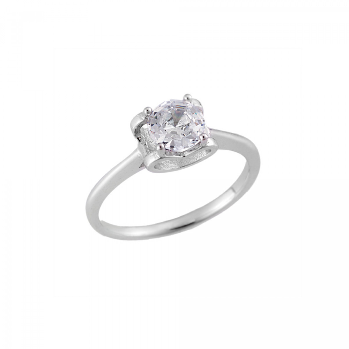 Ασημένιο μονόπετρο δαχτυλίδι με λευκή κεντρική πέτρα ζιργκόν. To σχέδιο κάτω απο την πέτρα σχηματίζει καρδιά.