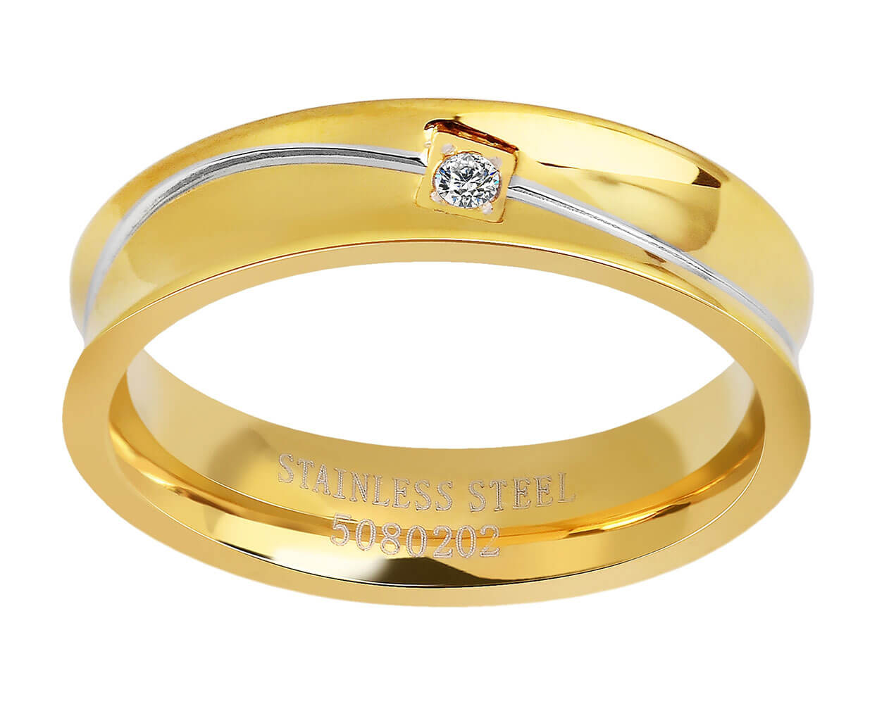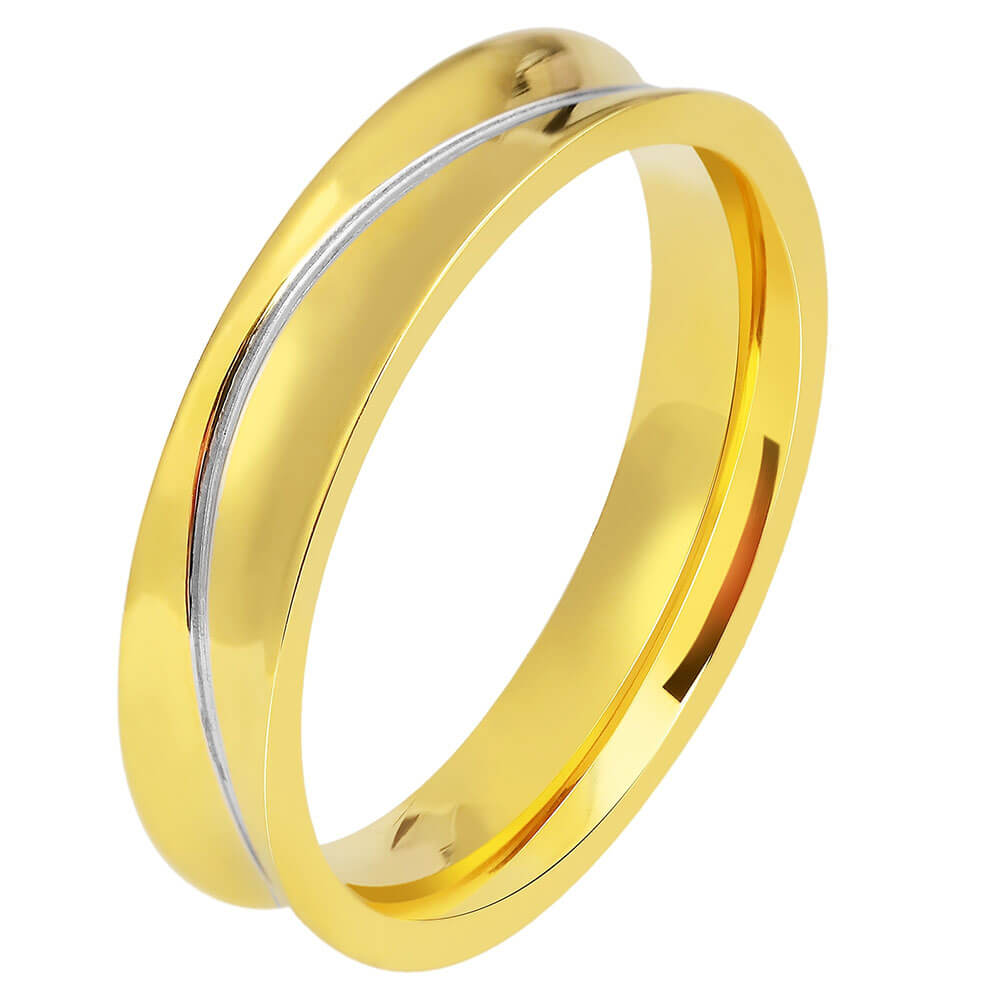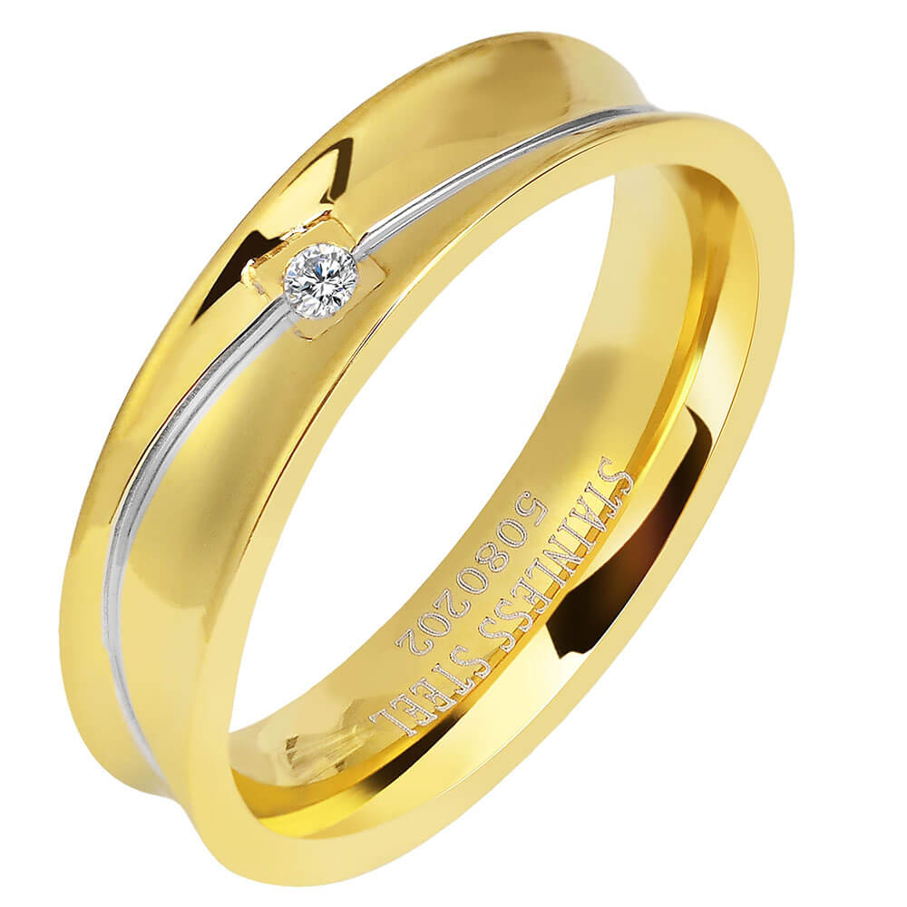Γυναικεία βέρα από ανοξείδωτο ατσάλι, σε χρυσό χρώμα με ασημί λεπτομέρεια και λευκή πέτρα.