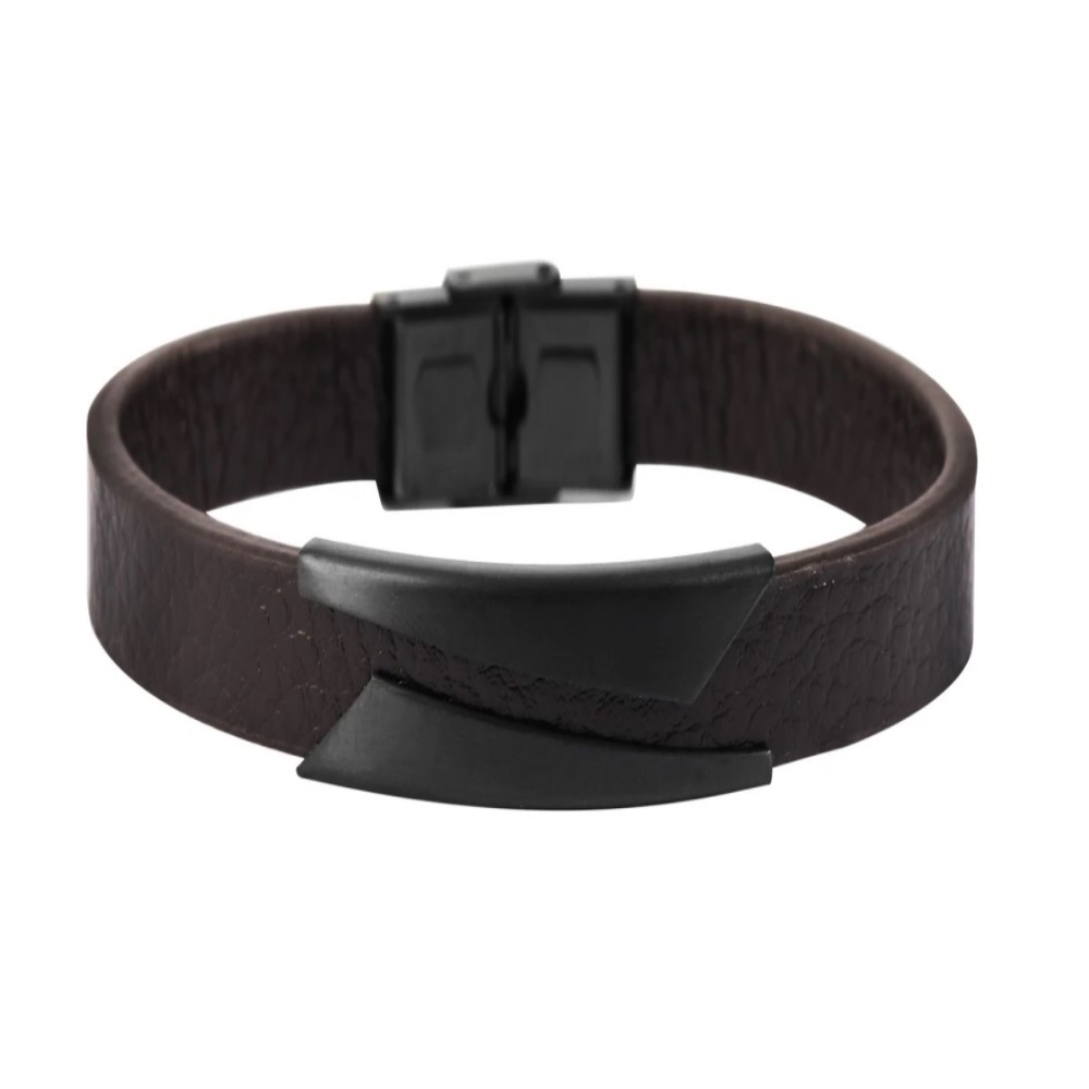 Δερμάτινο βραχιόλι, σε μαύρο χρώμα με ασημί κούμπωμα από ανοξείδωτο ατσάλι και χαράξιμη πλάκα.