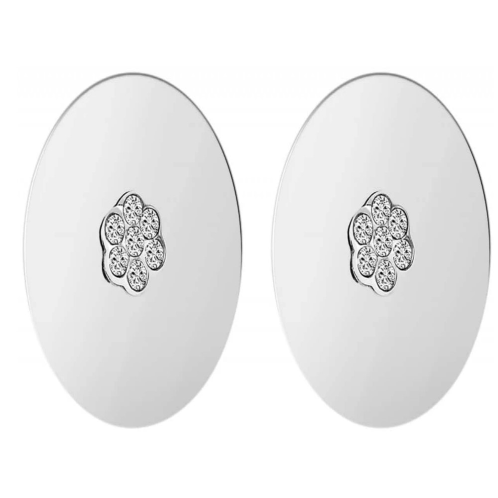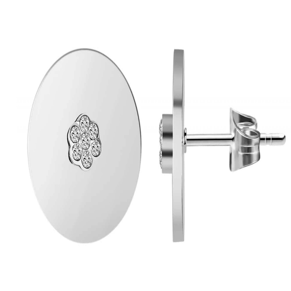 Ατσάλινα γυναικεία καρφωτά σκουλαρίκια, σε ασημί χρώμα, με λευκά ζιργκόν στο κέντρο τους.