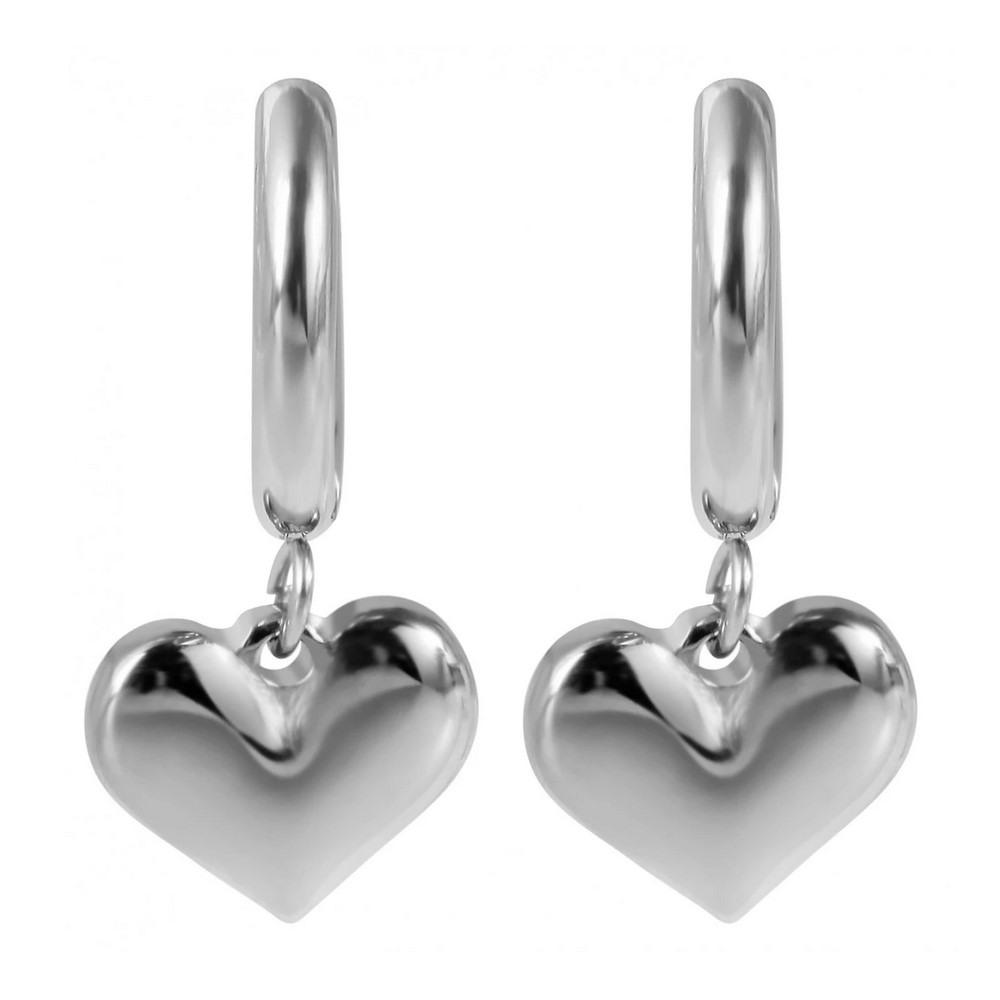 Ατσάλινα γυναικεία σκουλαρίκια κρίκοι με κρεμαστή καρδιά, σε ασημί χρώμα.