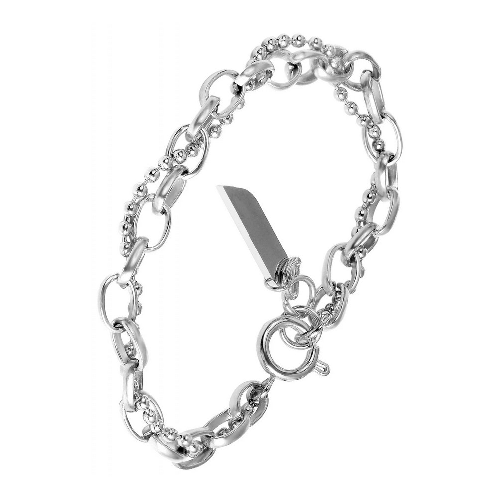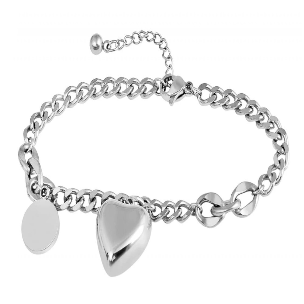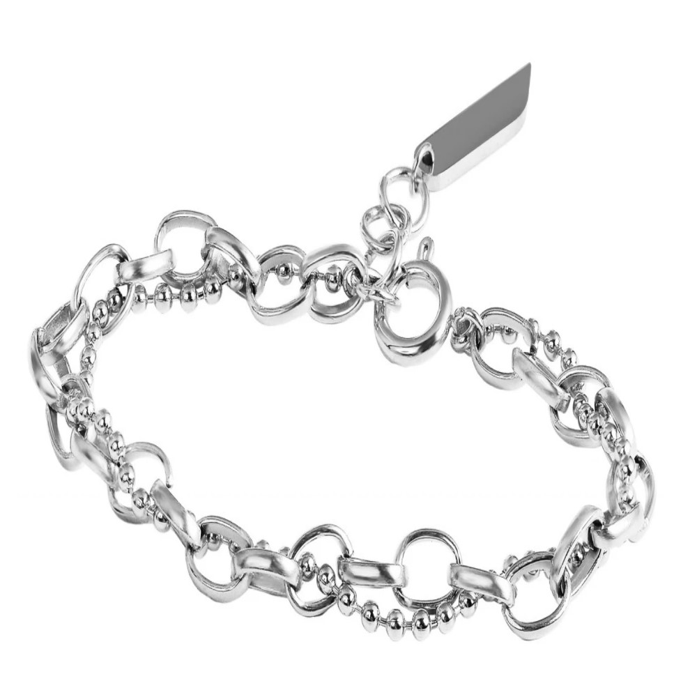 Ατσάλινο γυναικείο διπλό βραχιόλι, σε ασημί χρώμα, με χαράξιμο κρεμαστό μοτιφ.
