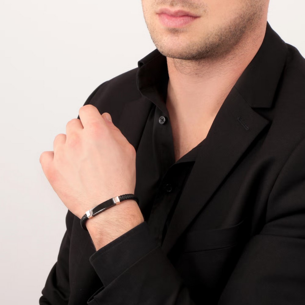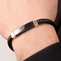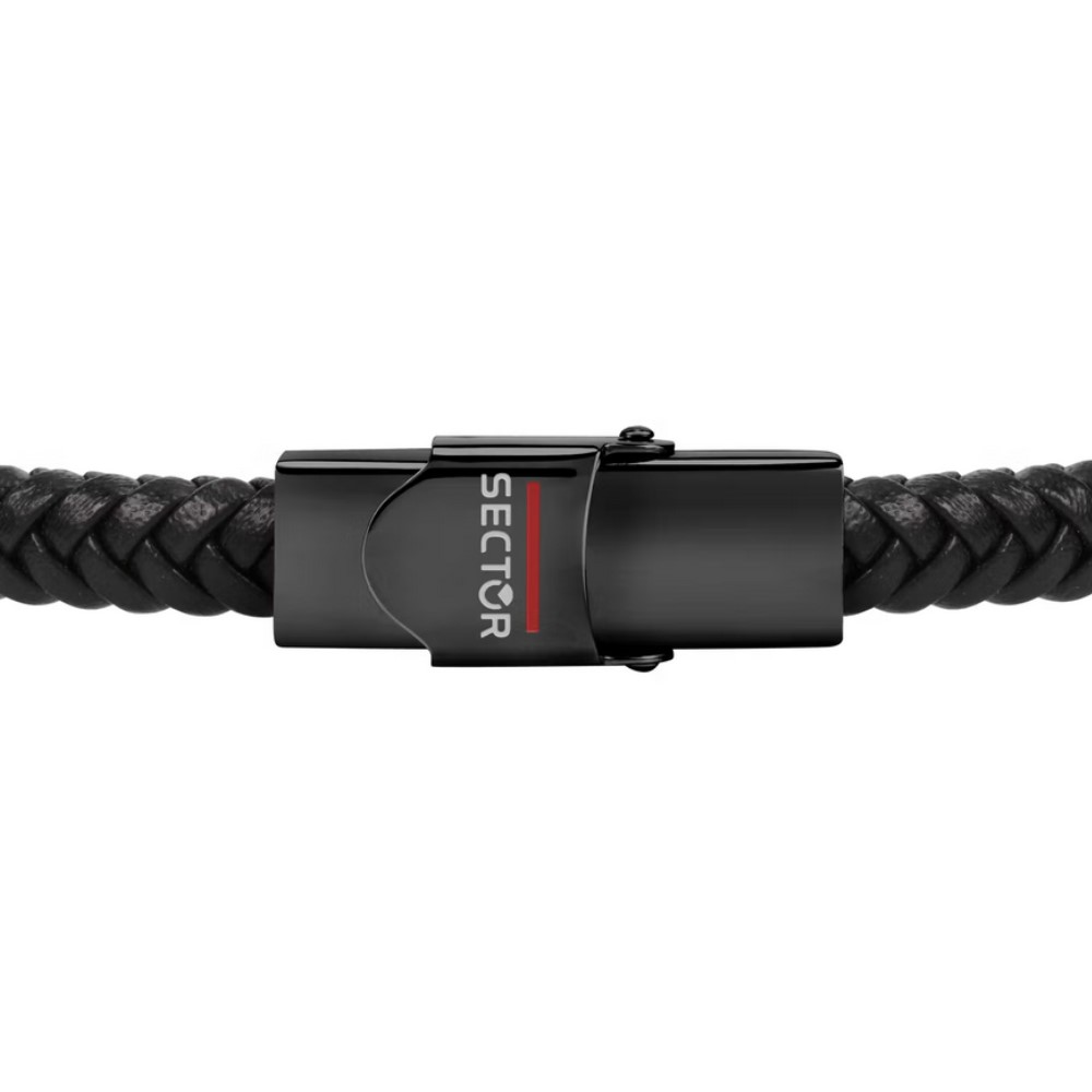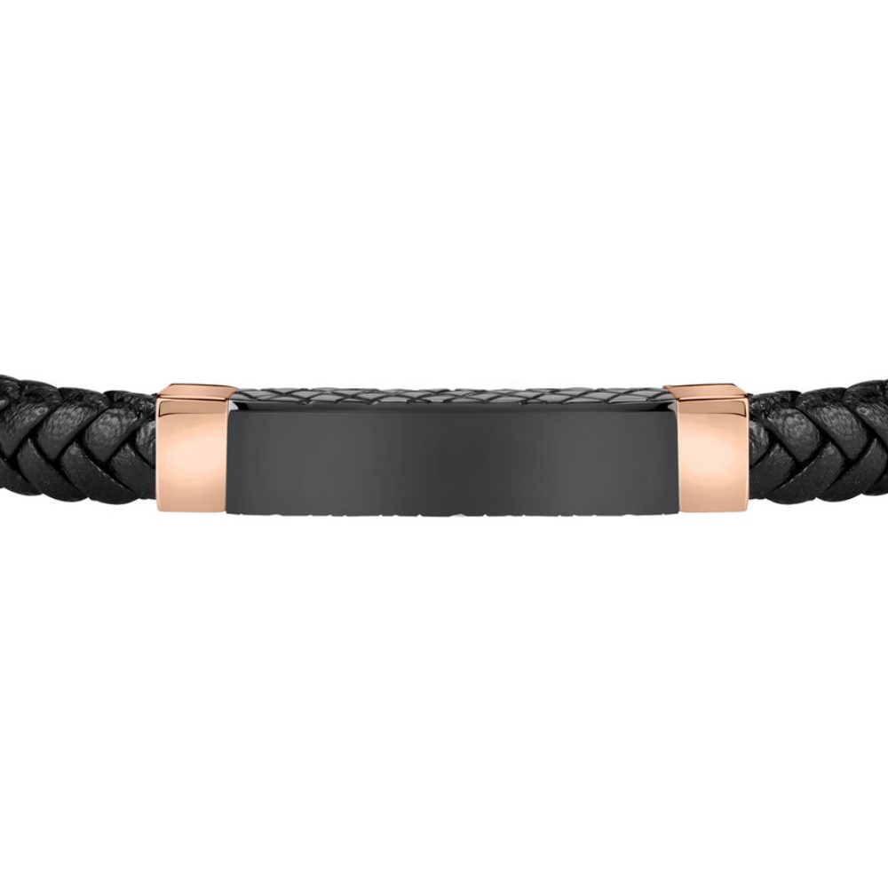 Ανδρικό βραχιόλι Sector, από μαύρο δέρμα και ανοξείδωτο ατσάλι, με ροζ χρυσές λεπτομέρειες.