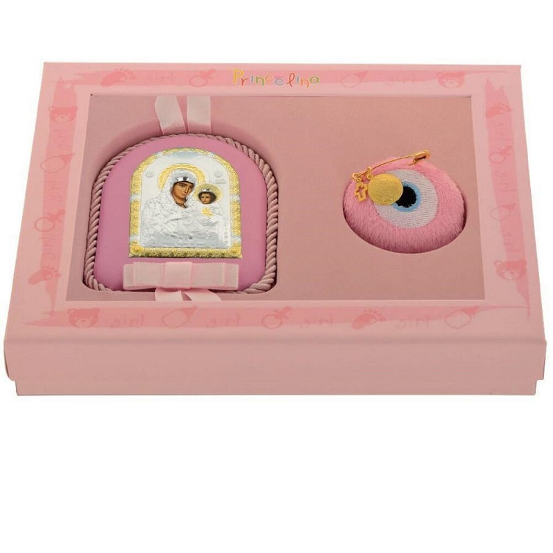 Ασημένιο Παιδικό σετ με Κορνίζα και Παναγίτσα Κούνιας 9080-MA/S140-3R