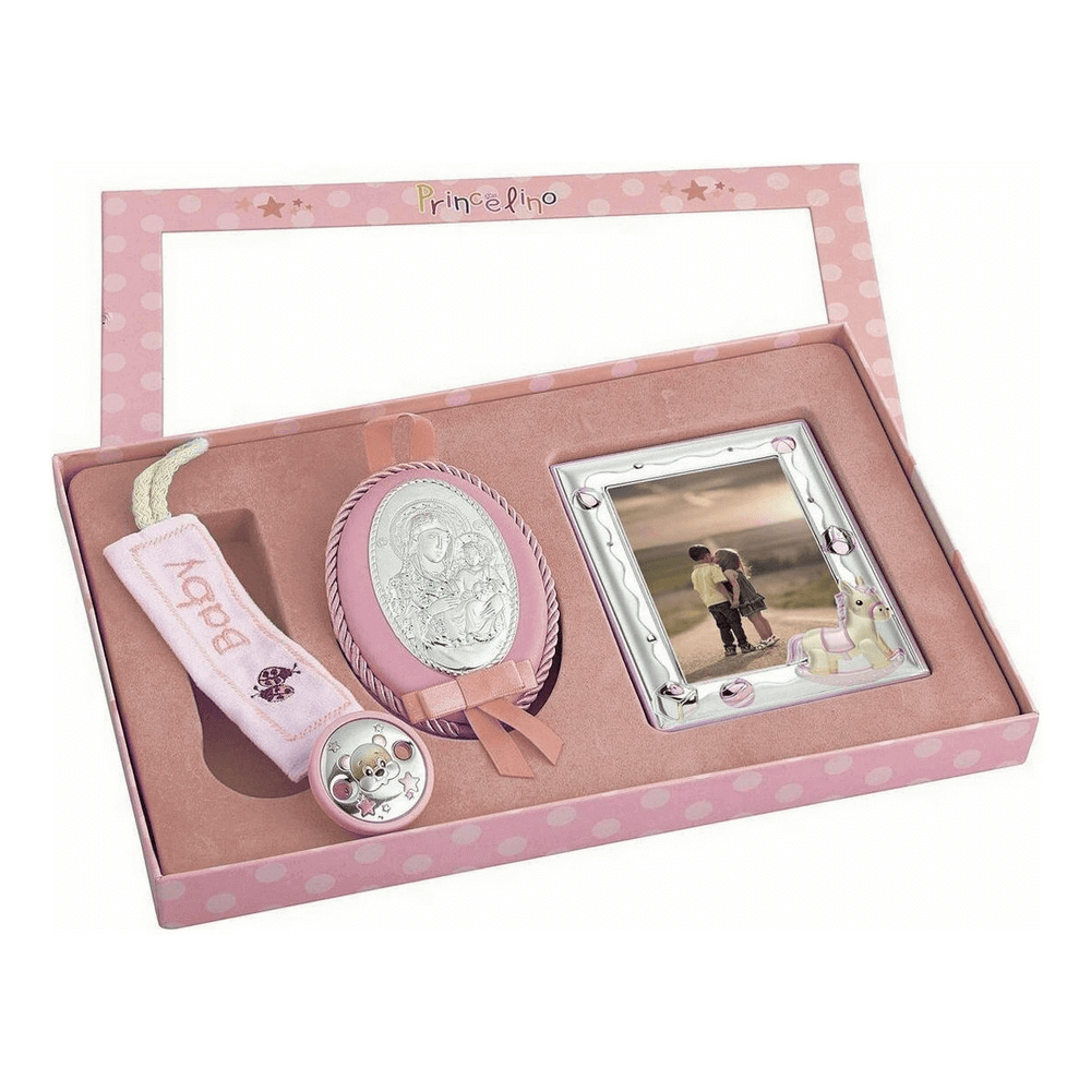 Ασημένιο παιδικό σετ κορνίζα αλογάκι, με Παναγίτσα και πιπιλοπιάστρα για κορίτσι. H κορνίζα διαθέτει ξύλινη βάση στην απόχρωση του ροζ και η Παναγίτσα μπορεί να κρεμαστεί στην κούνια του μωρού.