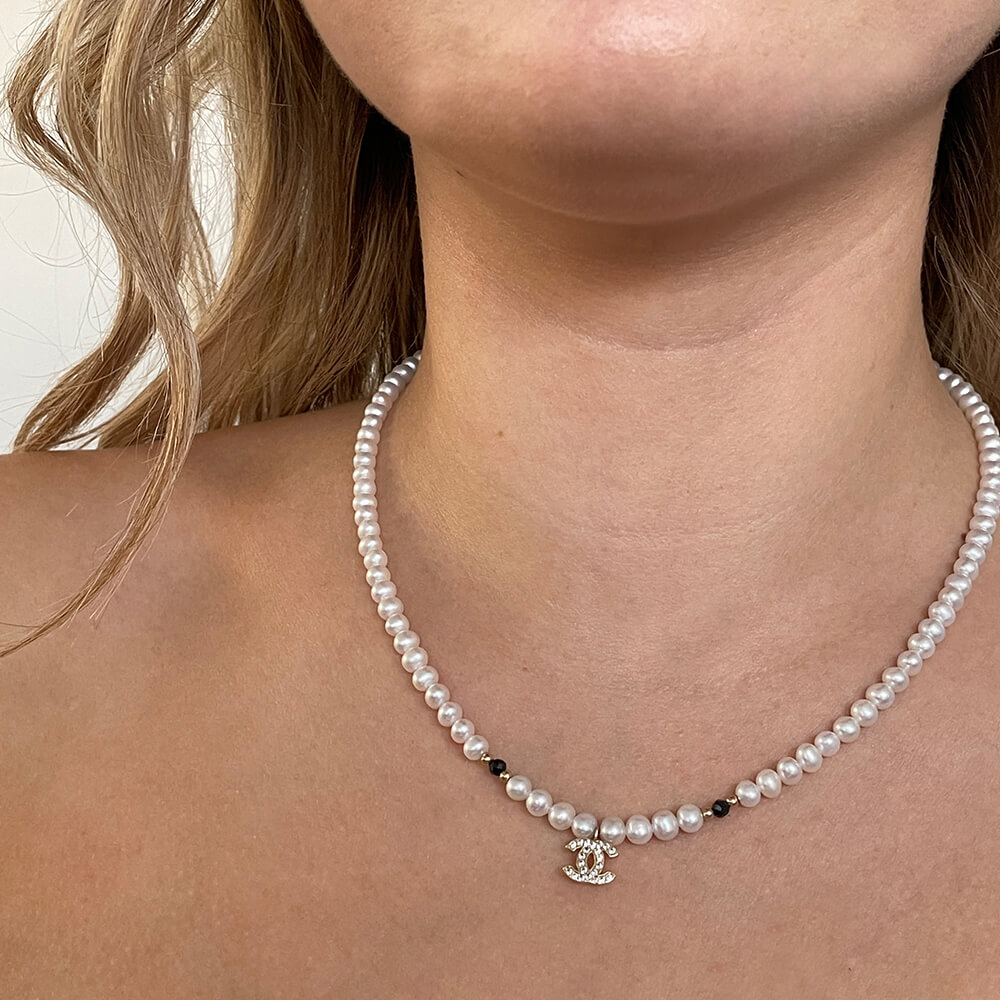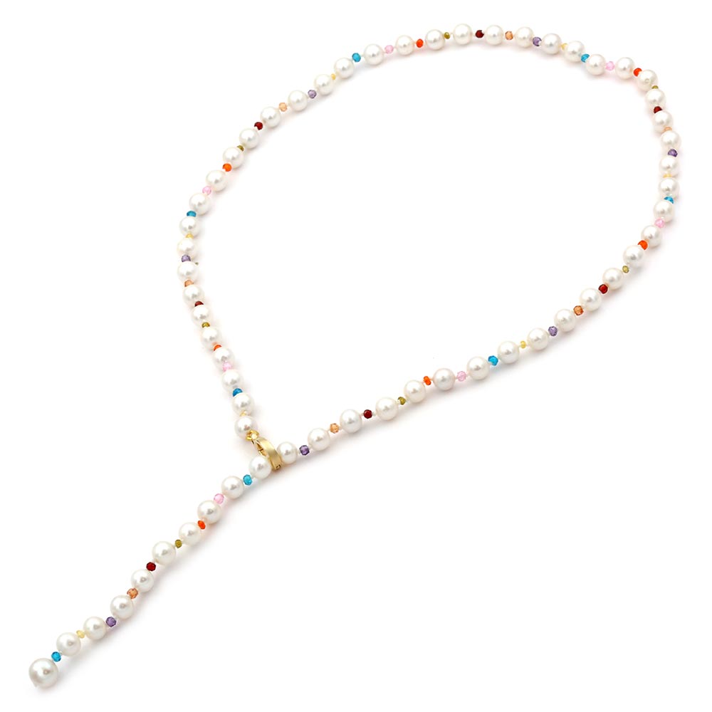 Κολιέ με λευκά μαργαριτάρια γλυκού νερού Fresh Water Pearl διαμέτρου 4,0 – 4,5 χιλιοστών σε σχήμα Round (στρόγγυλο) ποιότητας ΑΑΑ. Στο κέντρο του υπάρχει 1 μενταγιόν με ζιρκόν από χρυσό 14 καρατίων. Δεξιά και αριστερά από το μενταγιόν υπάρχουν 2 μπλε ζιρκόν πολυεδρικής κοπής καθώς και 4 χρυσές μπίλιες 14 καρατίων. Διαθέτει επίσης χρυσό κούμπωμα ασφαλείας 14 καρατίων. Είναι δεμένο με ειδικό ατσαλόσυρμα υψηλής αντοχής σε κίτρινο χρωματισμό. Το συνολικό του μήκος είναι 43 – 44 εκατοστά, όμως μπορείτε να το παραγγείλετε σε όποιο μήκος επιθυμείτε.