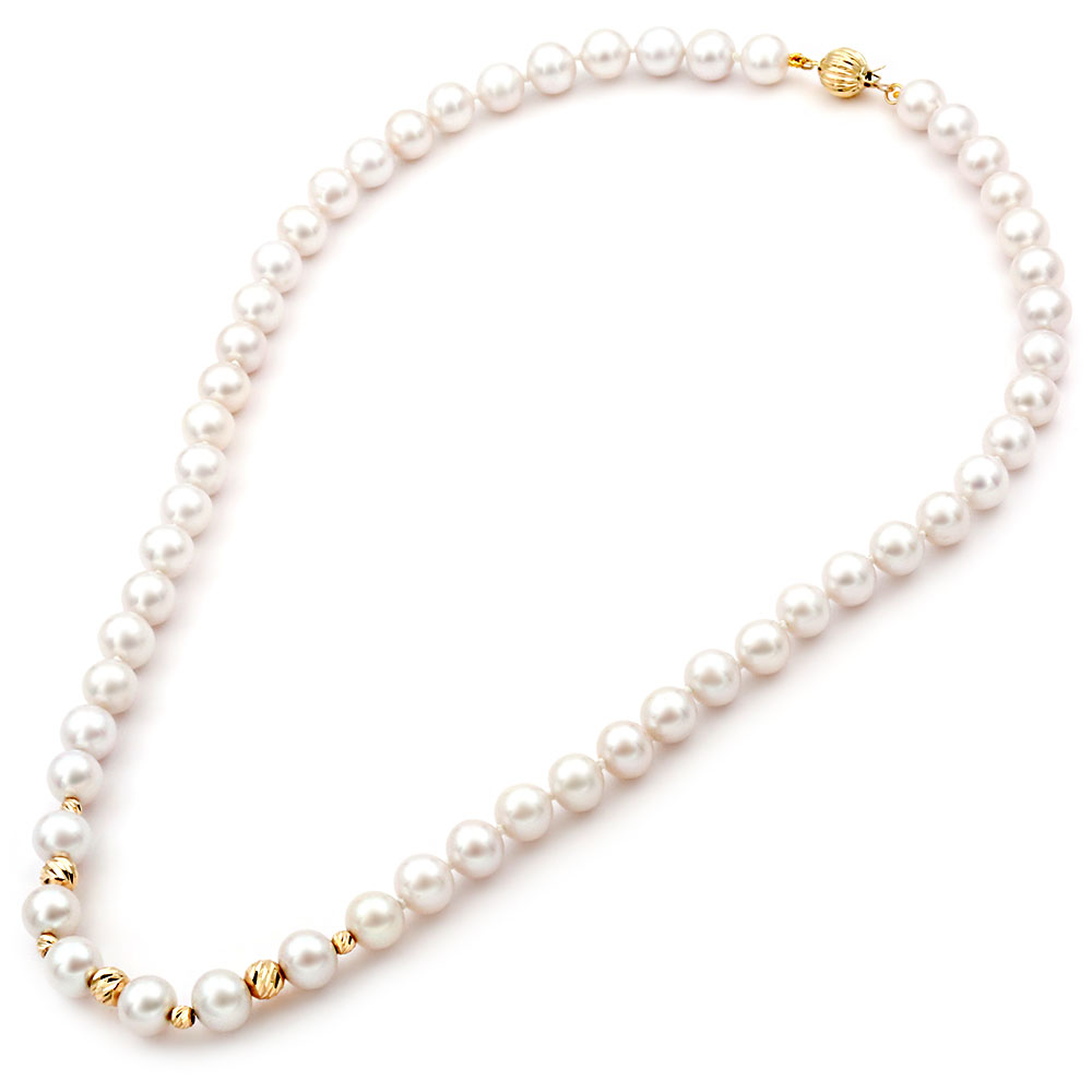 Κολιέ με λευκά μαργαριτάρια γλυκού νερού Fresh Water Pearl διαμέτρου 7,0 – 8,0 χιλιοστών σε σχήμα Round (στρόγγυλο) ποιότητας ΑΑΑ. Στο κέντρο του υπάρχουν 4 χρυσές μπίλιες 14 καρατίων με διάμετρο 3,0 χιλιοστά και 3 χρυσές μπίλιες 14 καρατίων με διάμετρο 5,0 χιλιοστά όλες με τεχνική του διαμανταρίσματος. Διαθέτει κούμπωμα διπλής ασφαλείας από χρυσό 14 καρατίων. Είναι δεμένο με μεταξωτό νήμα που δημιουργεί κόμπους ενδιάμεσα στα μαργαριτάρια για λόγους προστασίας και ασφάλειας. Το συνολικό του μήκος είναι 45 εκατοστά (Princess) το ιδανικό και προτεινόμενο μήκος κολιέ. Μπορείτε όμως να το παραγγείλετε σε όποιο μήκος επιθυμείτε.