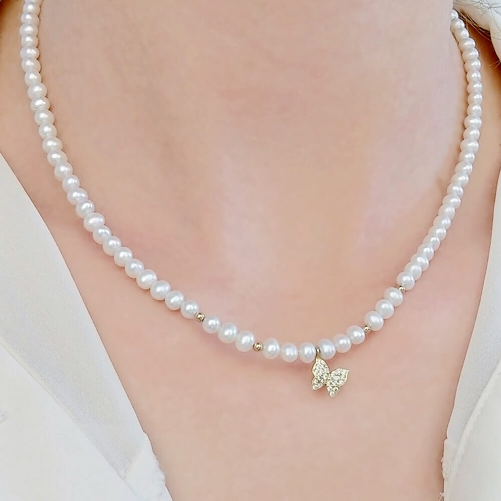 Κολιέ με λευκά μαργαριτάρια γλυκού νερού Fresh Water Pearl διαμέτρου 4,5 έως 5,0 χιλιοστών σε σχήμα Round (στρόγγυλο) ποιότητας ΑΑΑ. Διαθέτει κούμπωμα ασφαλείας από χρυσό 14 καρατίων. Είναι δεμένο με ειδικό ατσαλόσυρμα υψηλής αντοχής σε κίτρινο χρωματισμό. Το συνολικό του μήκος είναι 36 – 37 εκατοστά, όμως μπορείτε να το παραγγείλετε σε όποιο μήκος επιθυμείτε.