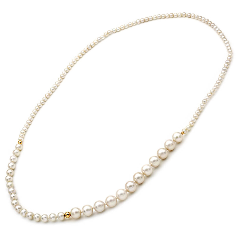 Κολιέ με λευκά μαργαριτάρια γλυκού νερού Fresh Water Pearl διαμέτρου 4,5 – 5,0 χιλιοστών σε σχήμα Round (στρόγγυλο) ποιότητας ΑΑΑ. Στο κέντρο του υπάρχει ένα χρυσό μενταγιόν 14 καρατίων με ζιρκόν σε σχήμα καρδιάς καθώς και 2 χρυσές μπίλιες 14 καρατίων με διάμετρο 2,5 χιλιοστά. Διαθέτει επίσης χρυσό κούμπωμα ασφαλείας 14 καρατίων. Είναι δεμένο με ειδικό ατσαλόσυρμα υψηλής αντοχής σε κίτρινο χρωματισμό. Το συνολικό του μήκος είναι 43 – 44 εκατοστά, όμως μπορείτε να το παραγγείλετε σε όποιο μήκος επιθυμείτε.