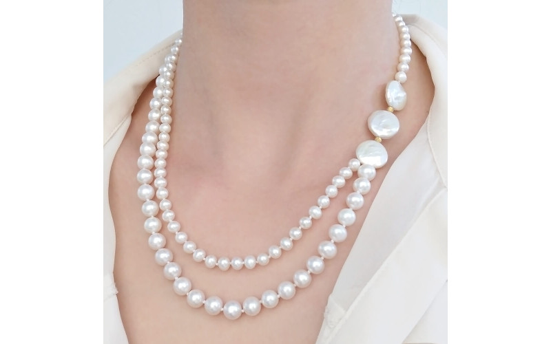 Κολιέ με λευκά μαργαριτάρια γλυκού νερού Fresh Water Pearl διαμέτρου 5,0 έως 8,0 χιλιοστών σε σχήμα Round (στρόγγυλο) ποιότητας ΑΑΑ. Στο κολιέ υπάρχουν 3 μαργαριτάρια γλυκού νερού Keshi Fresh Water Pearl διαμέτρου 14,0 χιλιοστών σε σχήμα Coin (νόμισμα) ποιότητας ΑΑΑ και 2 χρυσές μπίλιες 14 καρατίων διαμέτρου 3,0 χιλιοστών ανάμεσά τους. Διαθέτει κούμπωμα διπλής ασφαλείας από χρυσό 14 καρατίων. Είναι δεμένο με μεταξωτό νήμα που δημιουργεί κόμπους ενδιάμεσα στα μαργαριτάρια για λόγους προστασίας και ασφάλειας. Το συνολικό του μήκος είναι 45 – 47 εκατοστά, μπορείτε όμως να το παραγγείλετε σε όποιο μήκος επιθυμείτε.