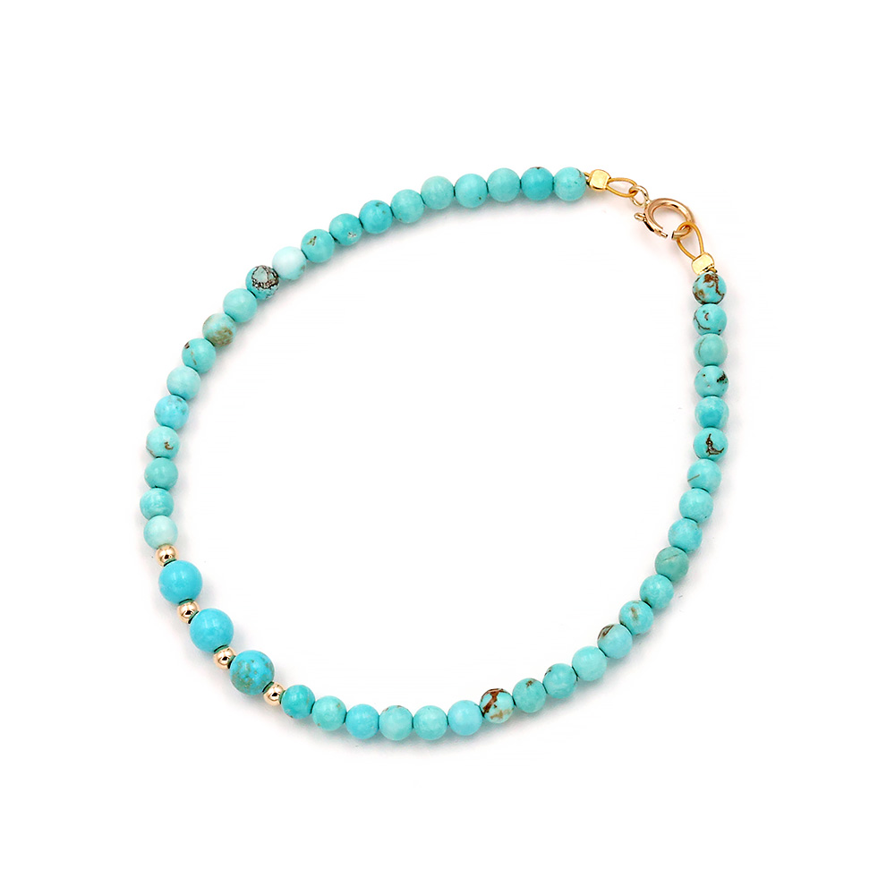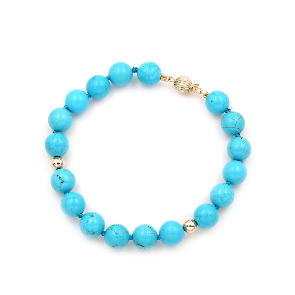 Βραχιόλι με Τιρκουάζ διαμέτρου 3,0 - 4,0 χιλιοστών. Διαθέτει 4 χρυσές μπίλιες και κούμπωμα ασφαλείας 14 καρατίων. Είναι δεμένο με ειδικό ατσαλόσυρμα υψηλής αντοχής σε κίτρινο χρωματισμό. Το συνολικό του μήκος είναι 18 – 19 εκατοστά, όμως μπορείτε να το παραγγείλετε σε όποιο μήκος επιθυμείτε.