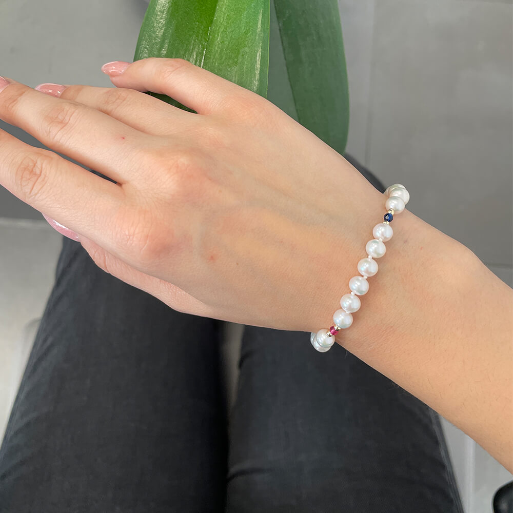 Βραχιόλι με λευκά μαργαριτάρια γλυκού νερού Fresh Water Pearl διάστασης 6,0 – 6,5 χιλιοστά σε σχήμα Round (στρόγγυλο) ποιότητας ΑΑΑ. Ανάμεσα στα μαργαριτάρια υπάρχουν 1 μπλε, 1 κόκκινο και 1 πράσινο Quartz πολυεδρικής κοπής καθώς και 6 χρυσές μπίλιες 14 καρατίων. Διαθέτει κούμπωμα διπλής ασφαλείας από χρυσό 14 καρατίων. Είναι δεμένο με μεταξωτό νήμα που δημιουργεί κόμπους ενδιάμεσα στα μαργαριτάρια για λόγους προστασίας και ασφάλειας. Το συνολικό του μήκος είναι 18-19 εκατοστά, μπορείτε όμως να το παραγγείλετε σε όποιο μήκος επιθυμείτε.