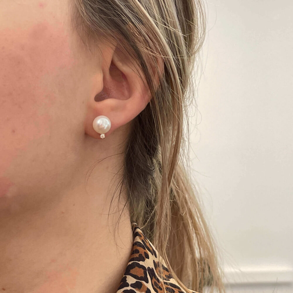 Σκουλαρίκια με λευκά μαργαριτάρια θαλάσσης Akoya Ιαπωνίας διαμέτρου 8,5 – 9,0 χιλιοστών σε σχήμα Round (στρόγγυλο) ποιότητας ΑΑΑΑ. Διαθέτει χρυσή βάση 18 καρατίων με 2 διαμάντια συνολικού βάρους 0,10ct VS1 H και κουμπώματα ασφαλείας.