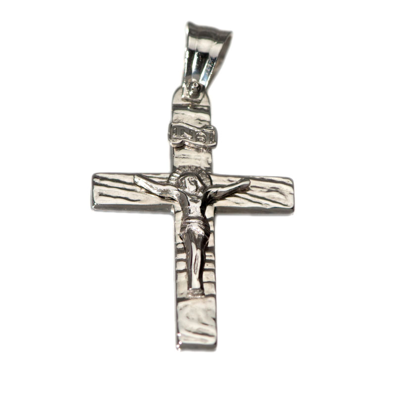 Λευκόχρυσος σταυρός 14 Καρατίων ανδρικός με σαγρέ επιφάνεια και την μορφή του εσταυρωμένου.