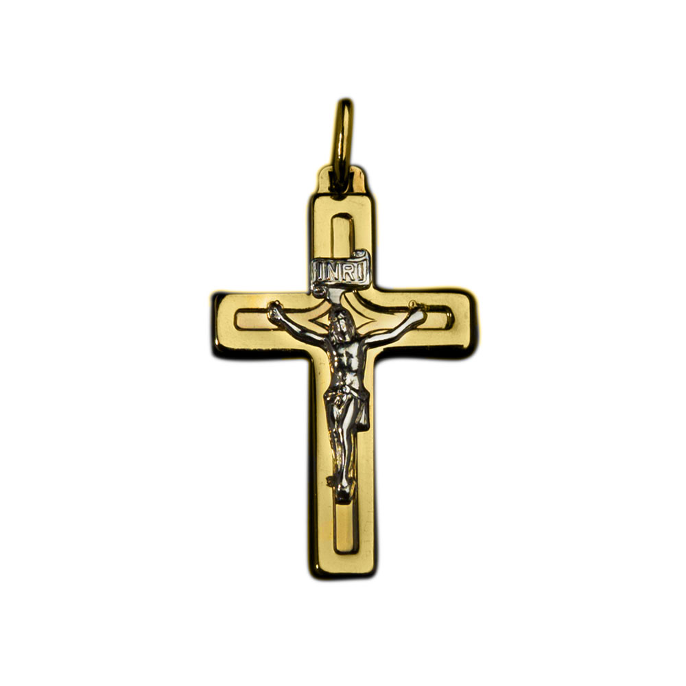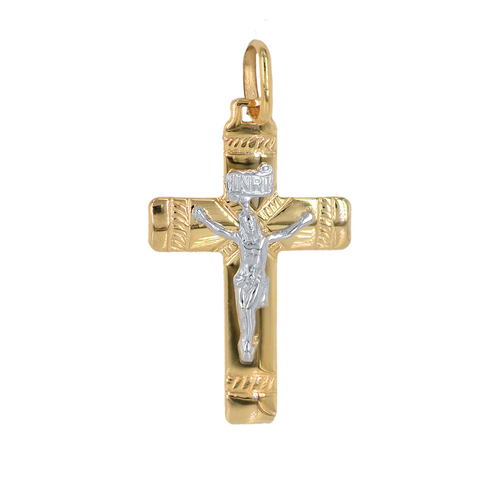 Χρυσός σταυρός 14 Καρατίων για αγόρι ή ανδρικός σε λουστρέ φινίρισμα, με την μορφή του εσταυρωμένου στο κέντρο σε λευκόχρυσο, χωρίς πλάτη.