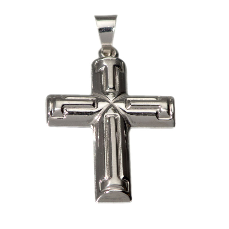 Λευκόχρυσος ανδρικός σταυρός 14 Καρατίων με λουστρέ φινίρισμα και ανάγλυφες γραμμές στην κάθετη πλευρά του.