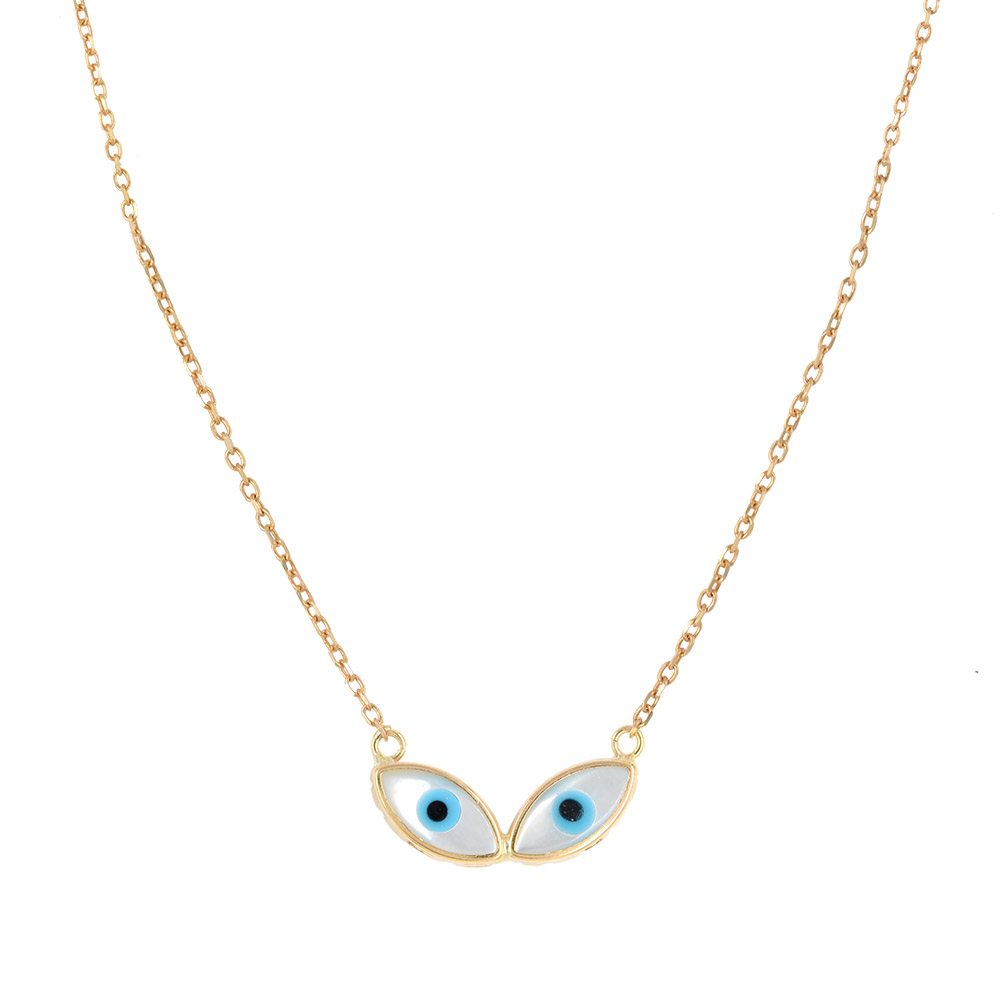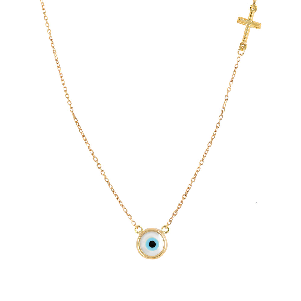 Χρυσό κολιέ 9 Καρατίων με στρογγυλό ματάκι λευκό και σταυρό.