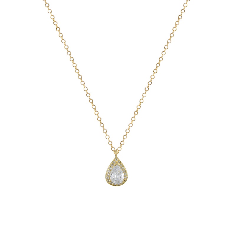 Ασημένιο κολιέ 925 επιχρυσωμένο, δάκρυ λευκό διακοσμημένο με λευκές πέτρες ζιργκόν στο περίγραμμα του.